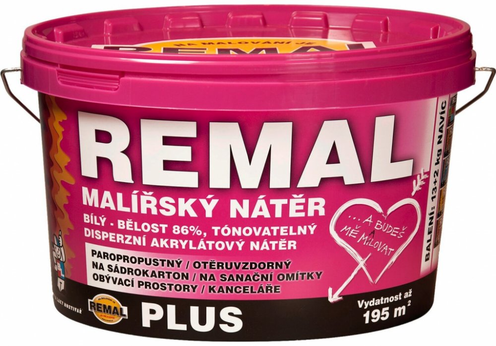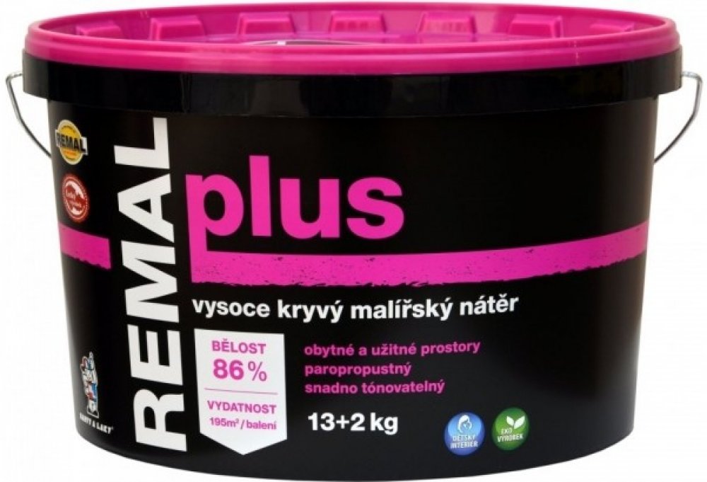 Remal Plus je bílá malířská barva je vysoce paropropustná, otěruvzdorná, rychleschnoucí, výborně kryjící a tónovatelná. Hodí se k nátěrům omítek, sanačních omítek, panelů z lehčených stavebních hmot apod. Používá se v interiérech, například v obytných prostorech, kancelářích nebo chodbách. Vydatnost: až 13 m2 / kg.