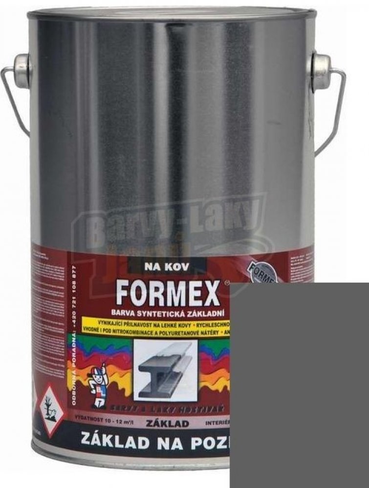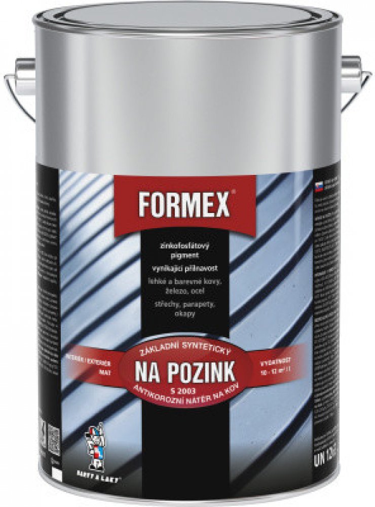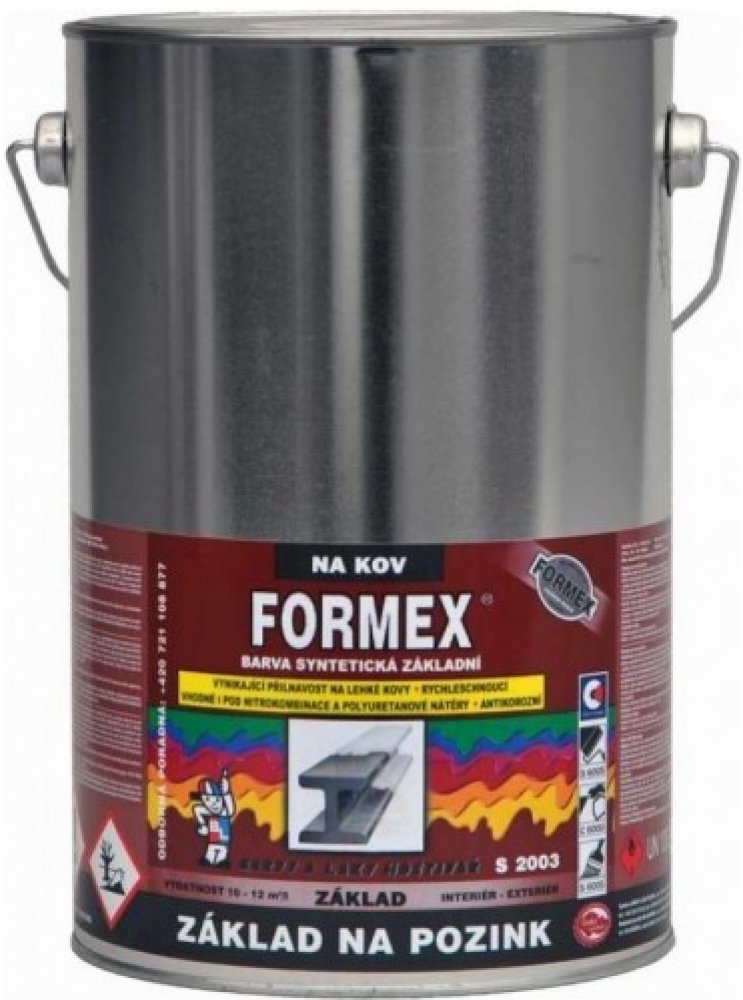 Použití Formex S2003 základ na pozink základní barva na kov:Podklad: ocel, železo, hliník, mosaz, zoxidovaný zinek, měď.Prostředí: interiér, exteriér – dle nátěrového systému.Příklady: kovové konstrukce, zárubně, kování, parapety, okapy, karosérie automobilů, plechové střechy, ocelové odlitky, litinové a plechové radiátory teplovodního topení.Vydatnost: 10 - 12 m2/l.