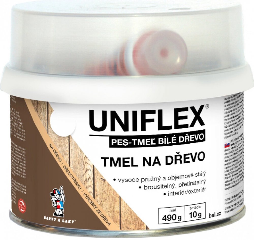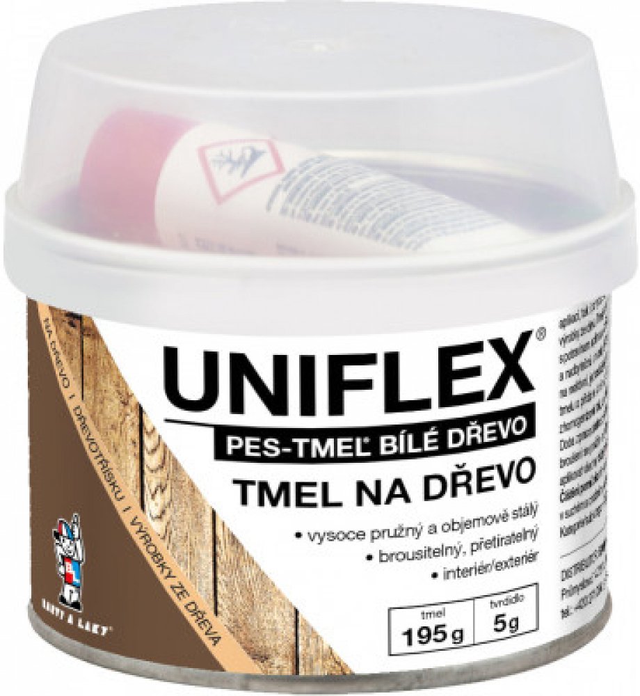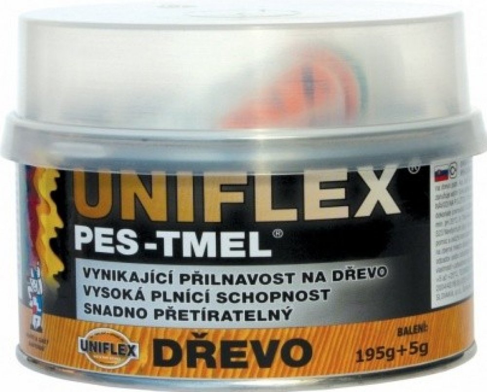 BARVY A LAKY HOSTIVAŘ Uniflex PES-TMEL dřevo tmel či lepidlo určené na tmelení středních a větších nerovností, vynikající přilnavost na většině povrchů, především na kov, ocel, kámen, beton, dřevo atd., přetíratelný, pro vnitřní i venkovní použití. Vynikající pro dřevěná okna, dveře, rámy atd. Vysoká plnící schopnost. Jemná struktura s vysokou tixotropií zaručuje velmi lehkou zpracovatelnost, bro...