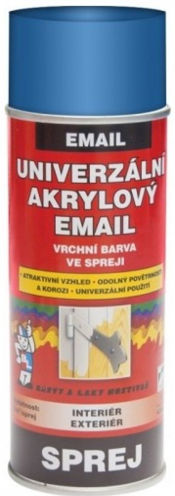 Univerzální vrchní barva se používá k nátěrům dřeva, kovu, karoserií, některých umělých hmot. Vyniká vydatností, je rychleschnoucí, po nástřiku nestéká. Je odolná proti povětrnostním vlivům a korozi. Je přestříkatelná Bezbarvým akrylovým lakem ve spreji. Barva není určena k nátěrům, které přicházejí do přímého styku s potravinami, krmivy a pitnou vodou a k nátěrům dětského nábytku a hraček. Použití:Všude tam, kde je třeba barva. Pro nové nátěry, osvěžení barvy, opravy, na dřevo, kov, karoserii, sklo, umělou hmotu, PVC (se základem), zdivo atd. Vydatnost:2 m²/ balení Před použitím: Povrch dobře připravit (suchý, čistý, bez rzi) Důkladně protřepat obsah, dokud neuslyšíte volný pohyb mísící kuličky uvnitř obalu, během použití několikrát opakovat. 20 °C je ideální teplota, nádobu držet ve vzdálenosti 25-30 cm od stříkané plochy a trysku zcela zatlačit. Nástřik vyzkoušet prvně na podobném vzorku. Pro určité povrchy doporučujeme velmi jemné vrstvy nastříkané z větší vzdálenosti v intervalech 15 min. Je vždy lepší nanášet 2 tenké vrstvy než jednu silnou. K čištění trysky nádobu obrátit dnem vzhůru a trysku zmáčknout tak dlouho dokud nevystupuje pouze vzduch bez barvy. Zanesenou trysku sejmout a pomocí jehly pročistit.