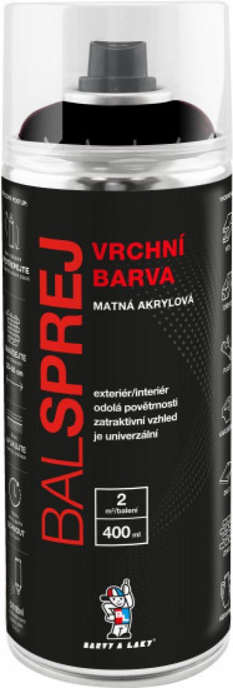 BALSPREJ je univerzální matná vrchní barva ve spreji použitelná k nátěrům dřeva, kovu, karoserií, některých umělých hmot. Vyniká vydatností, je rychleschnoucí, po nástřiku nestéká. Je odolná proti povětrnostním vlivům a korozi. Je přestříkatelná Bezbarvým akrylovým lakem ve spreji.