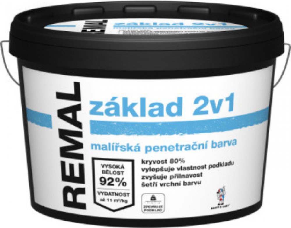 REMAL ZÁKLAD 2v1 je interiérová vodou ředitelná bílá malířská barva kombinující parametry penetrace a podkladové barvy. Výrazně snižuje spotřebu finálního nátěru, sjednocuje savost podkladu a zvyšuje jeho pevnost. Je vhodná pod nátěry realizované malířskými barvami REMAL. Je doporučena zejména na sádrokartonové desky, lze ji použít i na jiné pevné minerální podklady. Má vynikající krycí schopnost a vysokou bělost. Může sloužit i pro snazší zakrývání sytých odstínů. Oblast použití - Podklad: sádrokartony, omítky a jiné podklady - Prostředí: interiér Odstíny Vyrábí se v nenormalizovaném bílém odstínu. Tónování je možné běžnými tónovacími pastami např. REMAL TEKUTÁ TÓNOVACÍ BARVA nebo REMAKOL. Parametry nátěrové hmoty - Viskozita: 2600-3200 mPas (Brookfield HB DV 2+ 4/100) - Obsah netěkavých látek: 65-69 % - pH: 8-9 - Objemová hmotnost: 1,62-1,67 g/cm3 - Vydatnost: až 11 m2/kg v jedné vrstvě - Ředění: vodou - Způsob aplikace: štětka, váleček, stříkání Nátěrový postup Podklad musí být soudržný, zbavený prachu a nečistot. Příliš savý a nesoudržný podklad doporučujeme ošetřit vhodnou akrylátovou penetrací, např. REMAL HLOUBKOVÁ PENETRACE. Povrch tak zbavíte prachu, sjednotíte savost a zaručíte přilnavost. Doba schnutí penetrace cca 4 h. Nerovnosti vyrovnejte výrobkem REMAL STĚRKA. Barvu v případě potřeby zřeďte v poměru max. 0,1 l vody na 1 kg barvy. Poté důkladně promíchejte. Nanášejte štětkou, válečkem nebo stříkáním v 1-2 vrstvách, další vrstvu nanášejte až po vyschnutí předešlé vrstvy. Optimální teplota pro natírání je 15 až 25 °C. Teplota podkladu a prostředí nesmí při aplikaci klesnout pod 5 °C. Na ucelené plochy použijte výrobek z jedné šarže, různé šarže před použitím smíchejte dohromady.