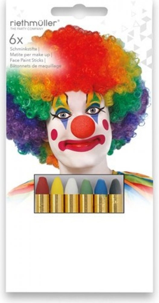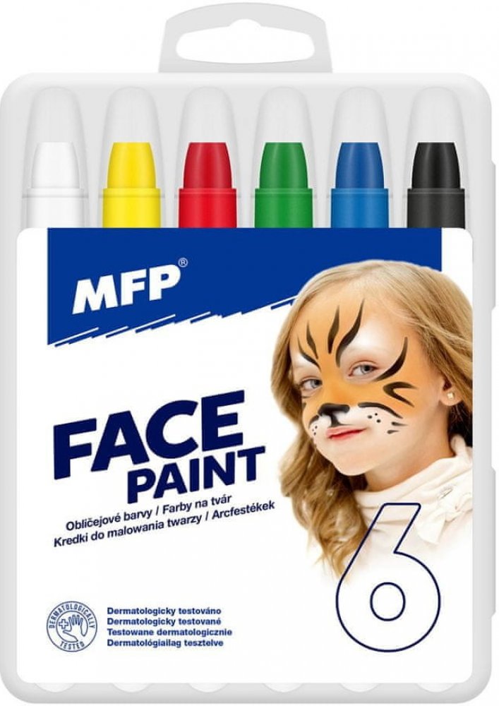 Set 6 ks barev na obličej na principu rtěnky (36g) - Díky těmto pestrým barvám vykouzlíte na tváři dítěte krásnou masku na karneval, párty nebo jinou oslavu. Dermatologicky testováno.BARVY:- bílá, červená, žlutá, zelená, modrá, černáNÁVOD NA POUŽITÍ:1. Doporučujeme vyzkoušet barvičky na méně citlivém místě. 2. Dojde-li k podráždění pokožky, nepoužívejte a vyhledejte lékaře.3. Nepoužívejte na rty a oči.4. Barvičkami malujeme na suchou pokožku.5. Jednoduše omyvatelné vodou a mýdlem, barvy zdravotně nezávadné.6. Nedoporučujeme nechávat na obličeji déle než 24 hodin. 7. Při použití doporučujeme dohled dospělé osoby.VAROVÁNÍ:Nevhodné pro děti do 3 let, nebezpečí spolknutí malých částí.Uvedená cena je za 1 balení. Všech 6 ks je baleno v plastové krabičce.