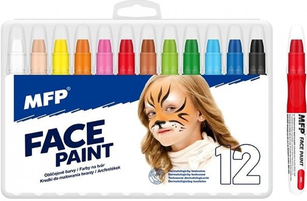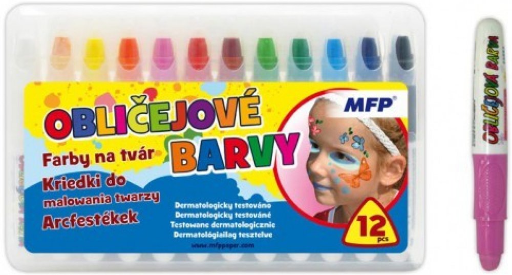 Set 12 ks barev na obličej na principu rtěnky (72g) Díky těmto pestrým barvám vykouzlíte na tváři dítěte krásnou masku na karneval, párty nebo jinou oslavu. Dermatologicky testováno. BARVY: - bílá, červená, žlutá, tmavě a světle zelená, tmavě a světle modrá, černá, tmavě a světle oranžová, růžová, hnědá,