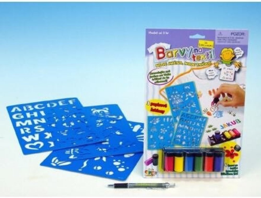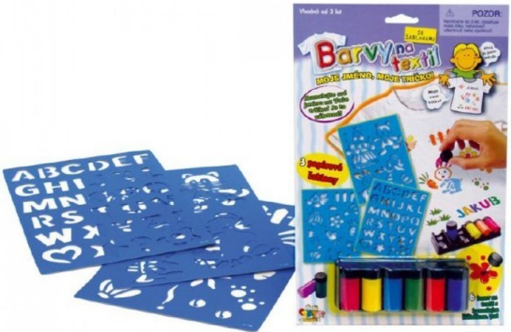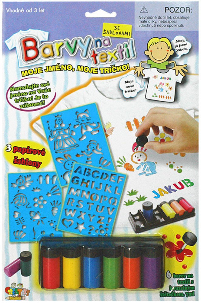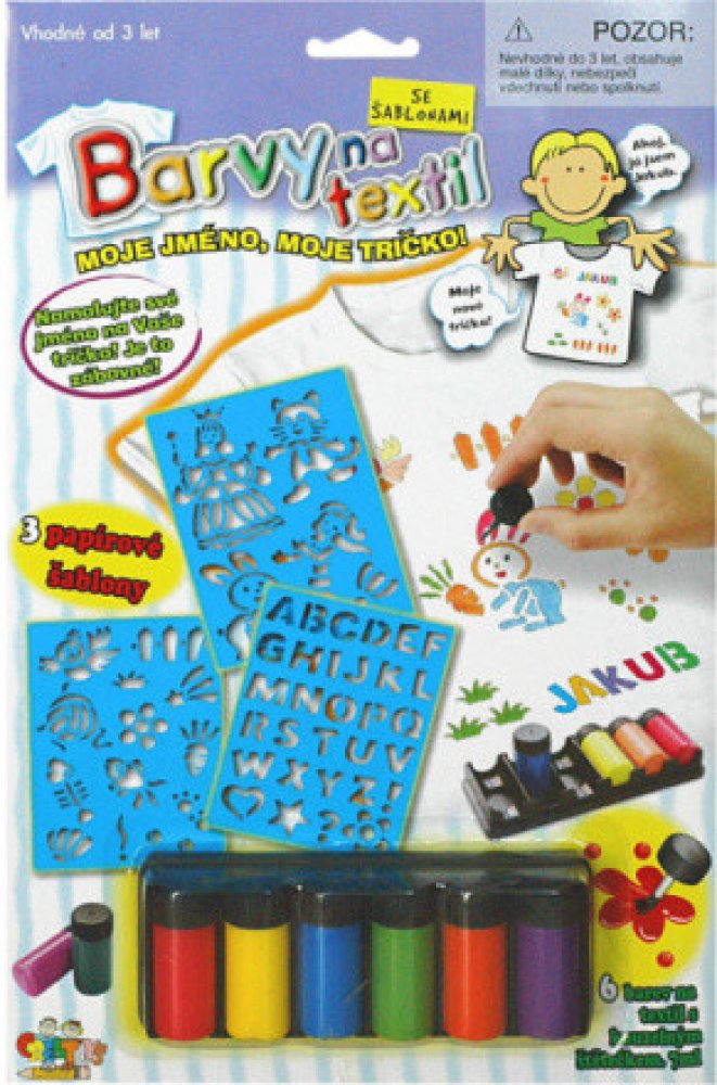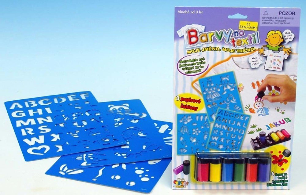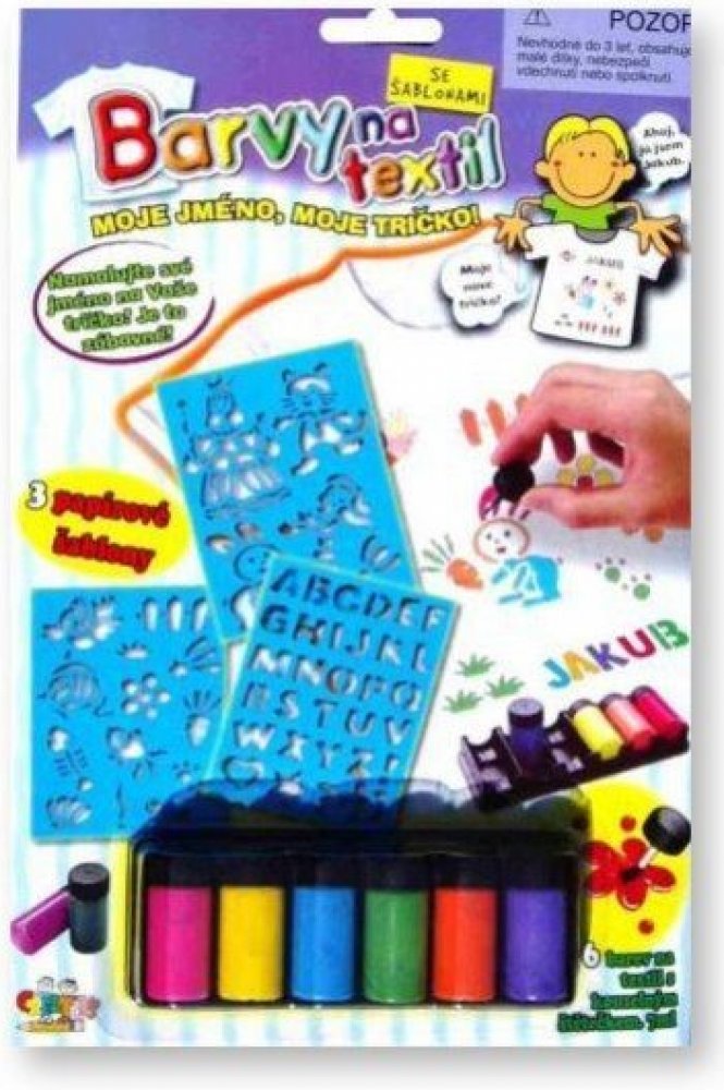 Vytvoř si tričko s vlastním jménem! Pomalujte si tričko vlastními obrázky nebo pomocí 3 papírových šablon. Nejprve nové tričko předeperte, abyste zabránili jeho sražení či zmenšení. Vyzkoušejte malbu na menším kousku. Vložte podložku do trička, aby barvy neprosákly skrz. Tužkou si můžete požadovaný obrázek předkreslit a pak pokračovat štětcem. Barvu důkladně promíchejte. Barvy jsou světlé a proto je lepší malovat na světlé podklady. První vrstvu barev nechce zaschnout asi 2 - 3 hodiny. Hotový obrázek nechte schnout 3 dny. Urychlit schnutí lze pomocí žehlení na nízkou teplotu přes jinou látku. Barvy způsobí, že podklad pod namalovaným obrázkem lehce ztvrdne. Po vyprání opět změkne. Balení obsahuje: 6 barev na textil se štětečkem - 7ml a 3 papírové šablony POZNÁMKA: Oblečení není součástí balení.