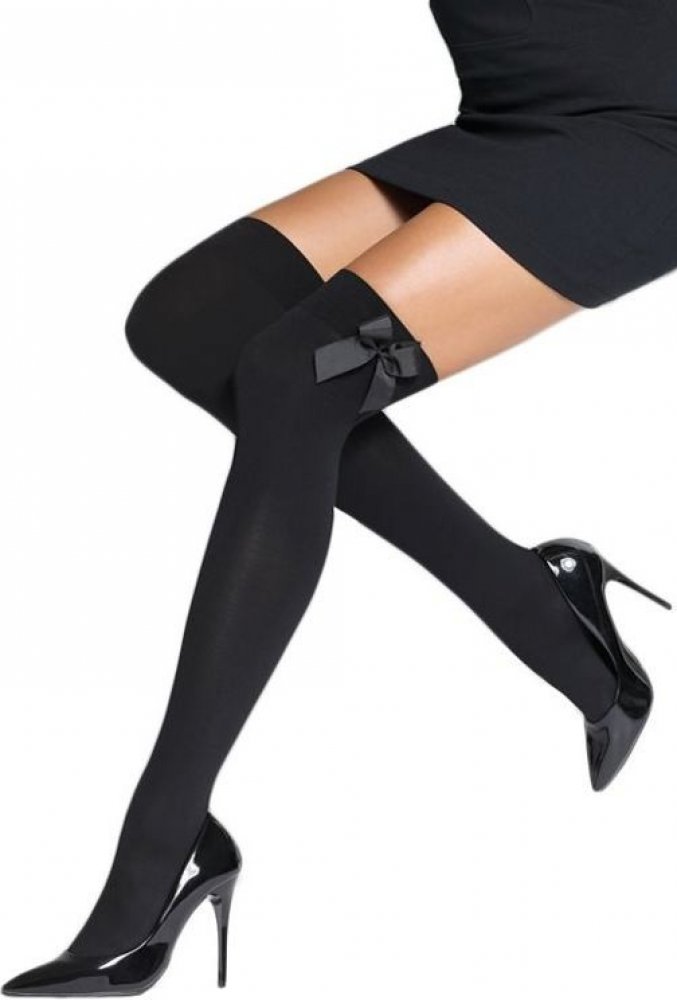 Černé samodržící punčochy v one size (univerzální) velikosti. Punčochy jsou vyrobeny z ojedinělého materiálu, který se výborně přizpůsobí různé velikosti. Dobře drží na místě díky silikonové vrstvě, kterou je potažená rubová strana lemů. Jsou zdobené pěknou mašličkou umístěnou na bocích. Výhodou těchto punčoch je i silnější materiál - 80 DEN.