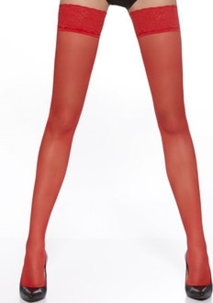 Hladké samodržící punčochy BAS BLEU HUSH 20 DEN v červené barvě. Punčochy jsou vyrobené z luxusního mikrovlákna s příměsí elastanu pro větší elasticitu a delší trvanlivost. Na horním okraji punčoch je krajkový lem se sillikonovými proužky (šířka krajkového lemu 8 cm), díky kterým punčochy dobře drží na místě a nekloužou.