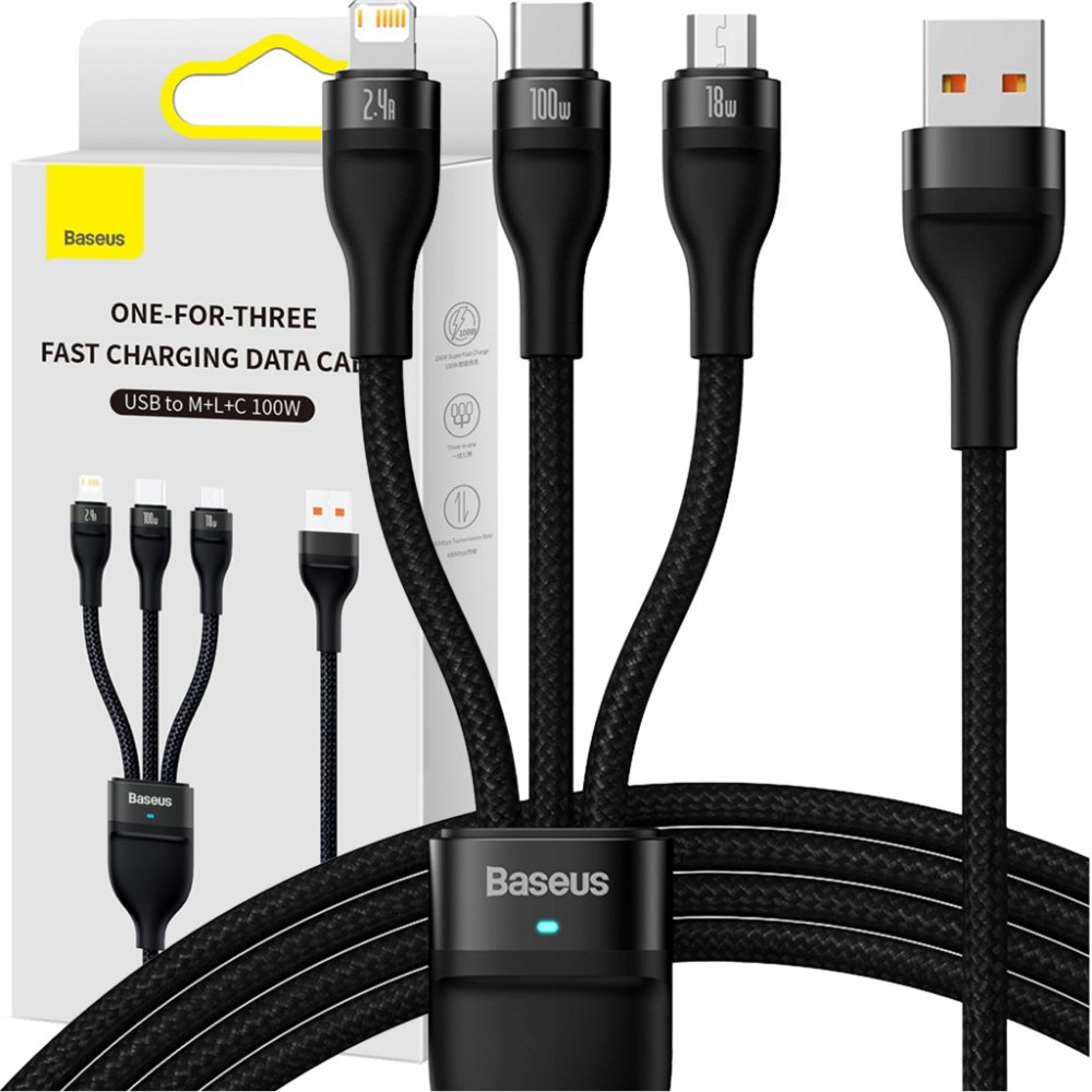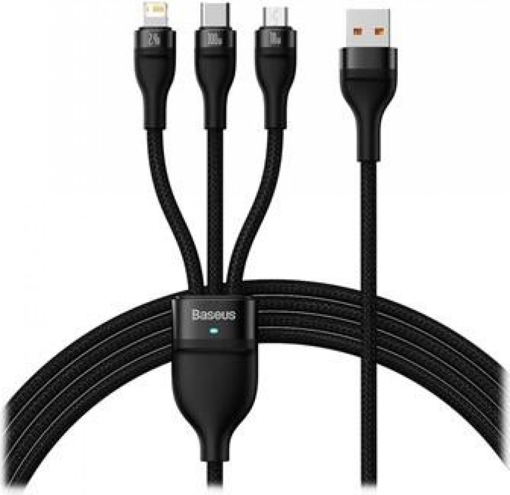 Baseus CASS030001 Flash Series 3v1 USB-A na USB-C, Lightning, MicroUSB 100W, 1,2m, černý
