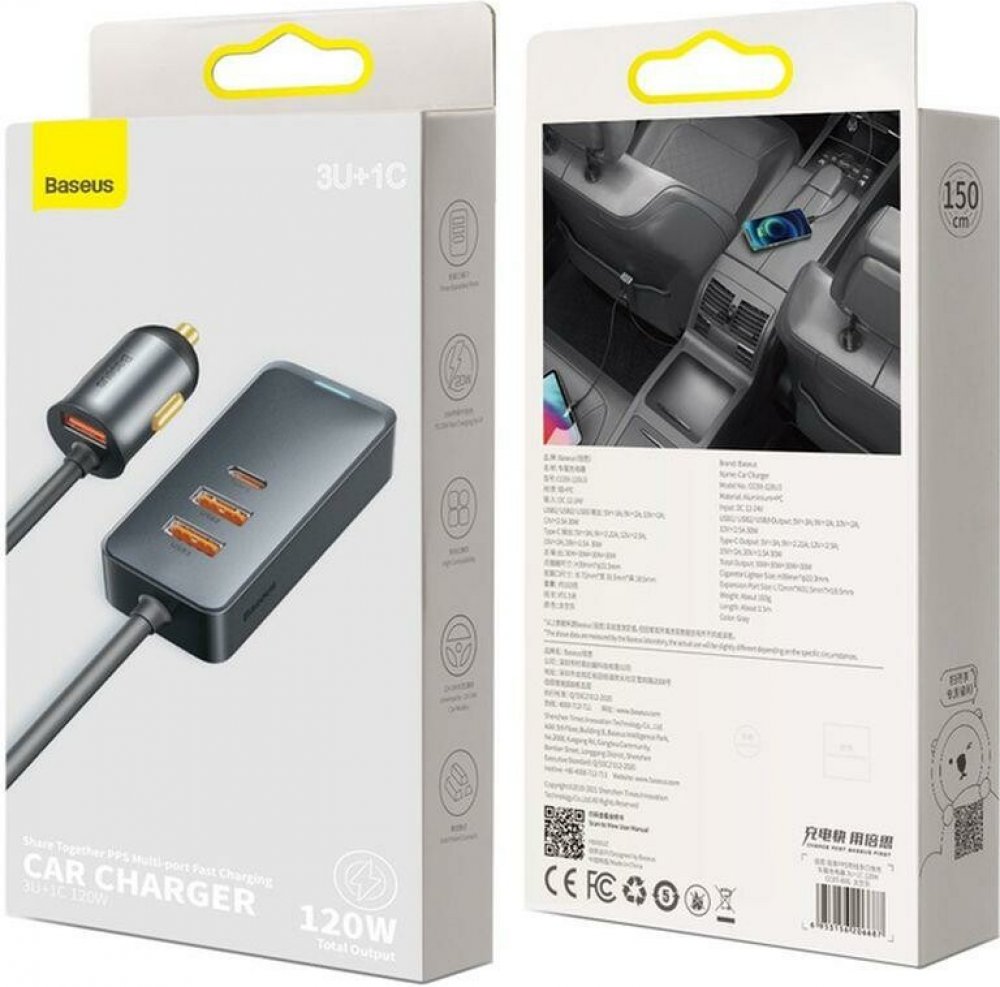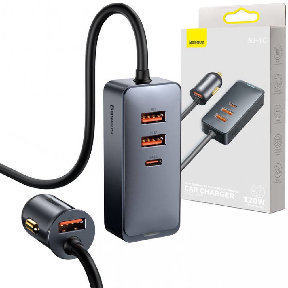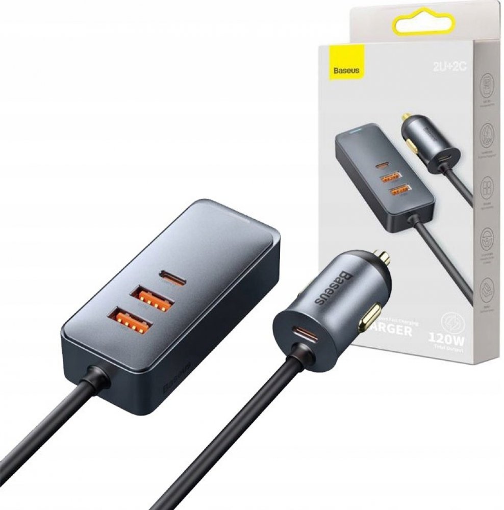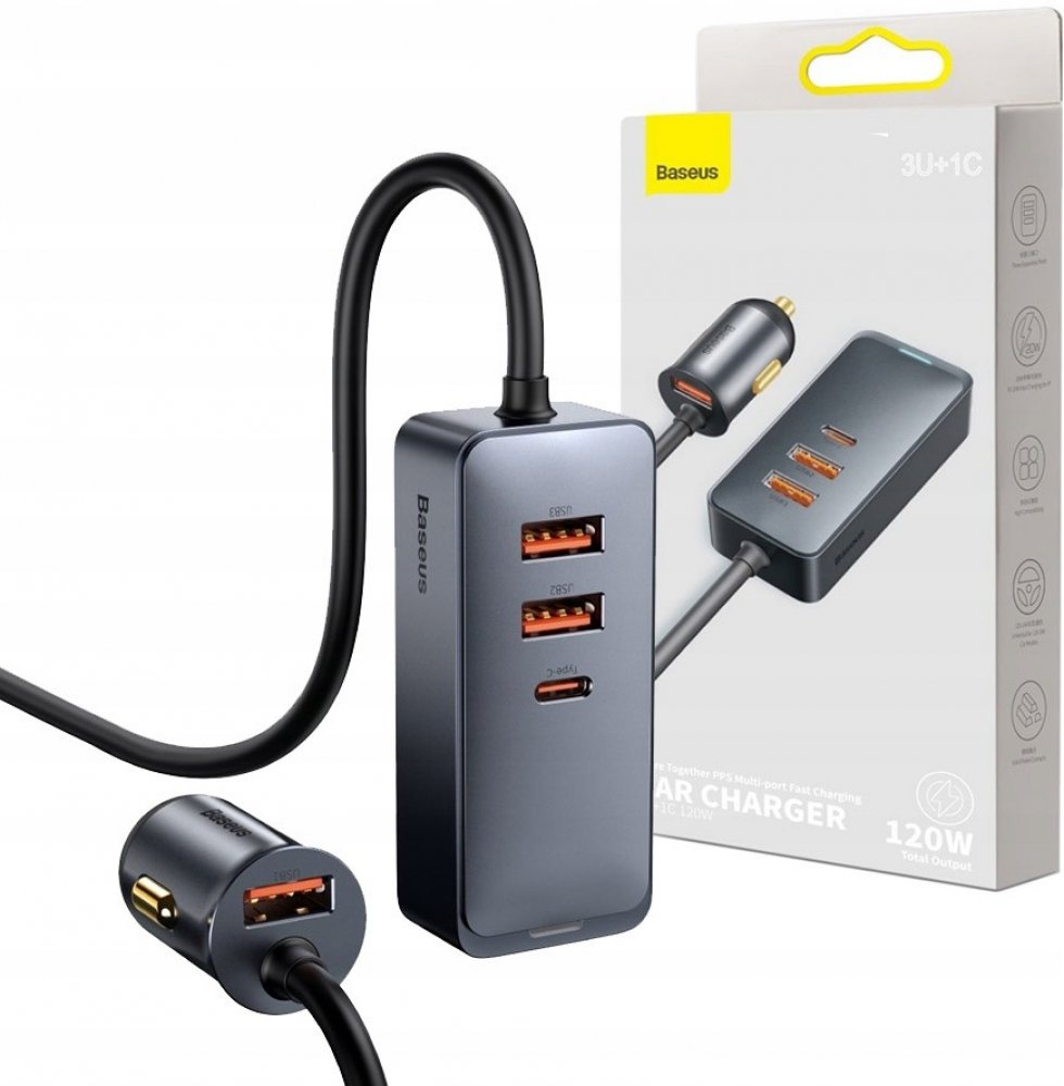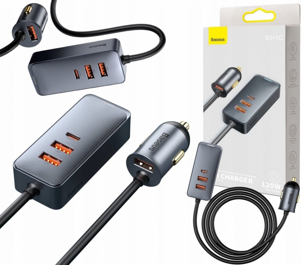 - Nabíječka do auta Baseus Share Together (CCBT-B0G) má také působivý výkon 120 W rozdělený na čtyři nabíjecí porty. Tři z těchto portů jsou USB-A , což znamená, že můžete nabíjet několik zařízení najednou, například telefony a tablety cestujících na zadních sedadlech. Kromě toho nabíječka Baseus Share Together (CCBT-B0G) je zde také port USB-C který je v moderních zařízeních stále oblíbenější. To znamená, že můžete nabíjet i ty, které tento standard podporují.