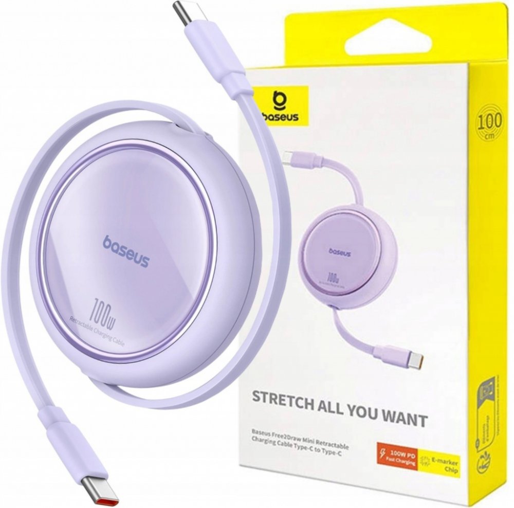 Baseus Free2Draw Mini Series / svinovací kabel USB-C - USB-C / 100W / 1m - fialový.