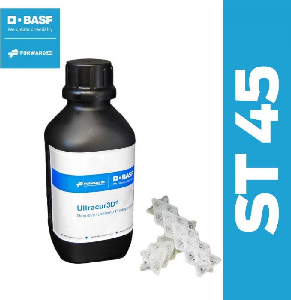 Ultracur3D® ST 45 B od společnosti Forward AM je reaktivní uretanový fotopolymer pro aplikace Tough, který poskytuje vynikající kombinaci vysoké pevnosti a dlouhodobé houževnatosti a odolnosti proti nárazu. Velmi dobře se hodí pro 3D tisk vysoce výkonných funkčních dílů vyžadujících vysokou přesnost a mechanickou pevnost. Zajišťuje velmi rychlý tisk a vynikající povrch.