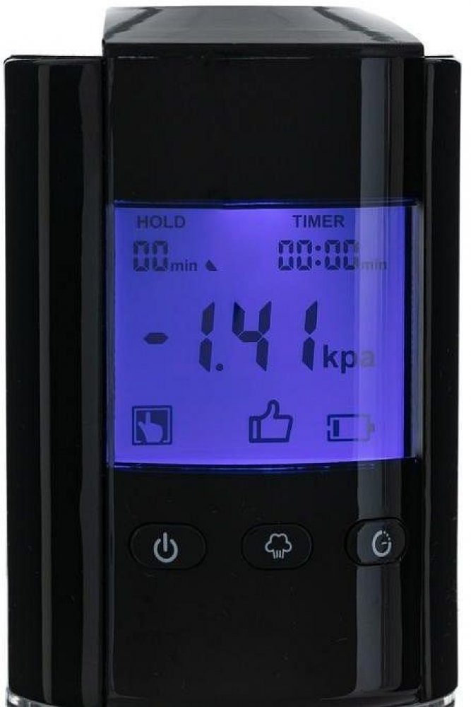 Ovládací jednotka (černá část s tlačítky), jednotka je odnímatelná. Nikdy ji neponořujte do vody! Na display se ukazuje míra dosaženého podtlaku v kPa. Dále jsou zde ikony manuálního nebo chytrého módu, stav baterie a časovač.