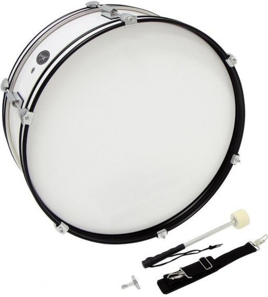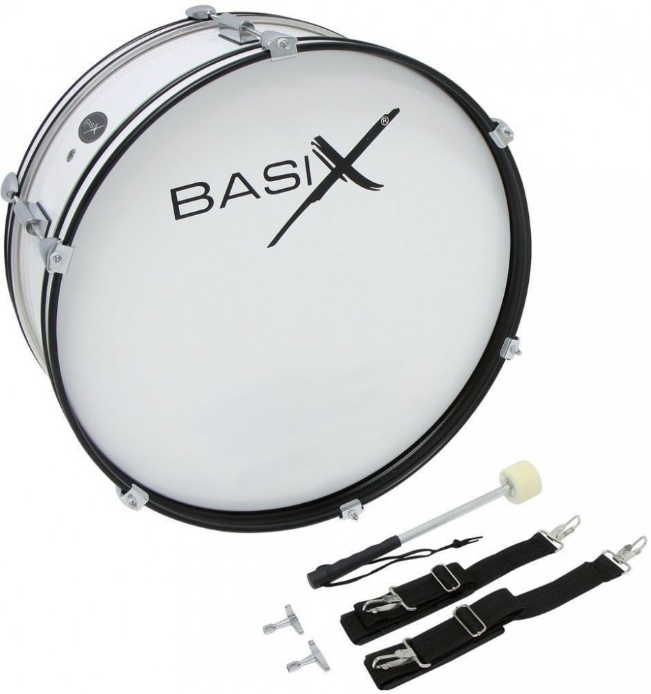 Juniorský pochodový basový buben značky Basix, patřící pod firmu GEWA. Velikost 22×7". Korpus je vyroben ze 6 vrstev dřeva, 6 napínacích šroubů, bílá barva. Včetně popruhu, palice a ladícího klíče. Vhodný pro školní a začínající soubory nebo jako buben na fandění pro sportovní fanoušky. Váha 5 kg, barva bílá.