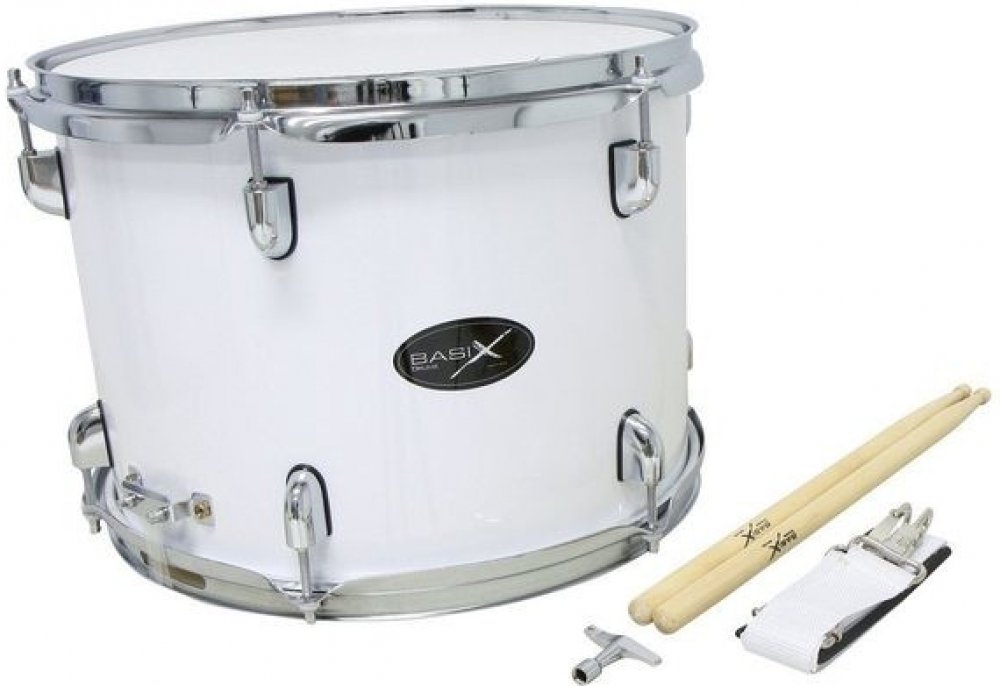 Pochodový buben Basix F893.100, kotel se snare struněním 14×10" včetně příslušenství Pochodový buben značky Basix, patřící pod firmu GEWA. Velikost 14×10". Korpus je vyroben ze 6 vrstev dřeva se 6 páry napínacích ladících šroubů, na spodní straně osazen snare struněním. Včetně popruhu, paliček a ladícího klíčku. Vhodný pro školní a začínající soubory nebo jako buben na fandění pro sportovní fanoušky. Barva bílá.