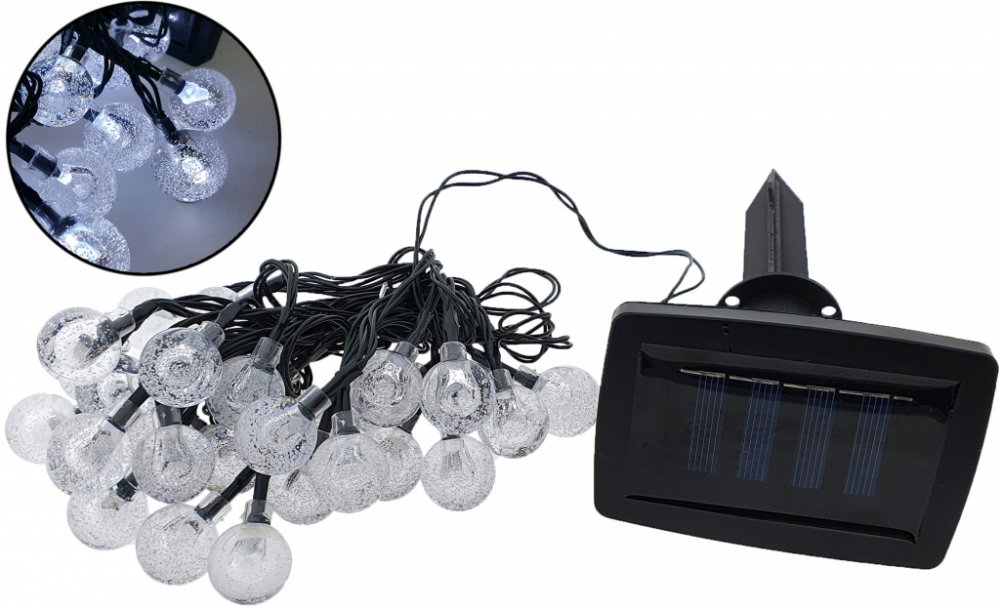 LED: 30ks bílých LEDSolární panel: polykrystalický křemíkBaterie: 1x 1,2V AA 300mAh Ni-Mh (součástí balení)Délka přívodního drátu: 2mVzdálenost mezi LED: 15cmCelková délka: 6,5m (4,5+2m) Průměr kuličky: 2,5cmPřepínač: ON / OFF