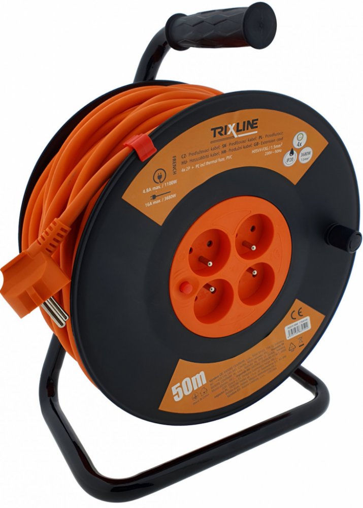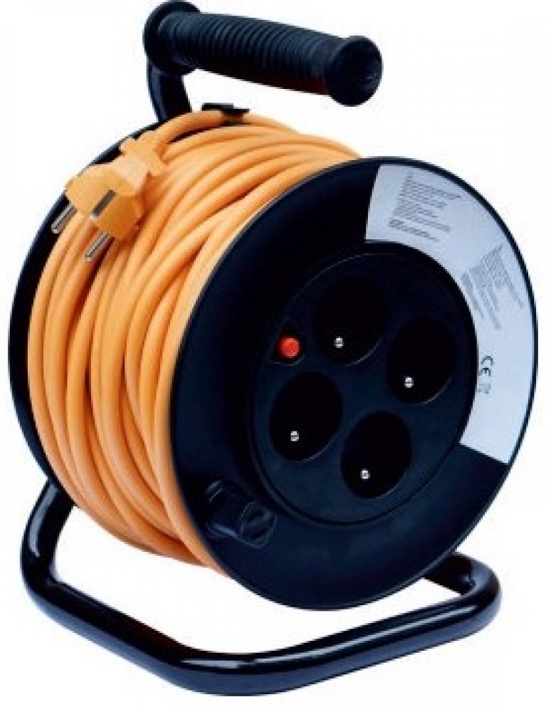 Prodlužovací kabel na bubnu, délka 50 m, 4 zásuvky, max. zatížení (navinutý/rozvinutý) 4,8(1100W)/16 A (3680W), pro spotřebiče s příkonem až 3680 W, napětí 220-240 V, kabel H05VV-F3G, průřez vodičů 3x1.5 mm2, kabel s plastovou izolací, stupeň krytí IP20 pro použití v suchém prostředí, vybaven vratnou tepelnou pojistkou.