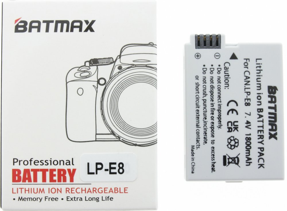Výkonná dobíjecí lithium-iontová baterie s vysokou kapacitou (1500mAh), která nahrazuje model Canon LP-E8. Li-Ion baterie dovoluje průběžné nabíjení bez rizika paměťového efektu, a navíc je oproti jiným typům baterií velmi lehká.