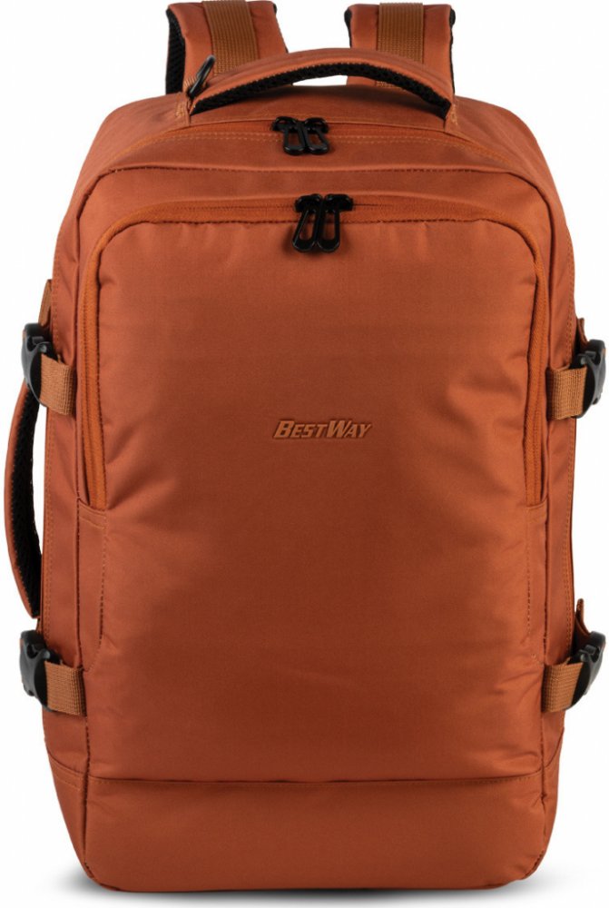 Cestovní multifunkční textilní batoh německé značky Bestway cabin pro v zajímavé cihlové barvě. Toto palubní zavazadlo si můžete vzít s sebou do letadla, jak vyžaduje společnost Ryanair. Má rozměry, které akceptuje většina leteckých společností.