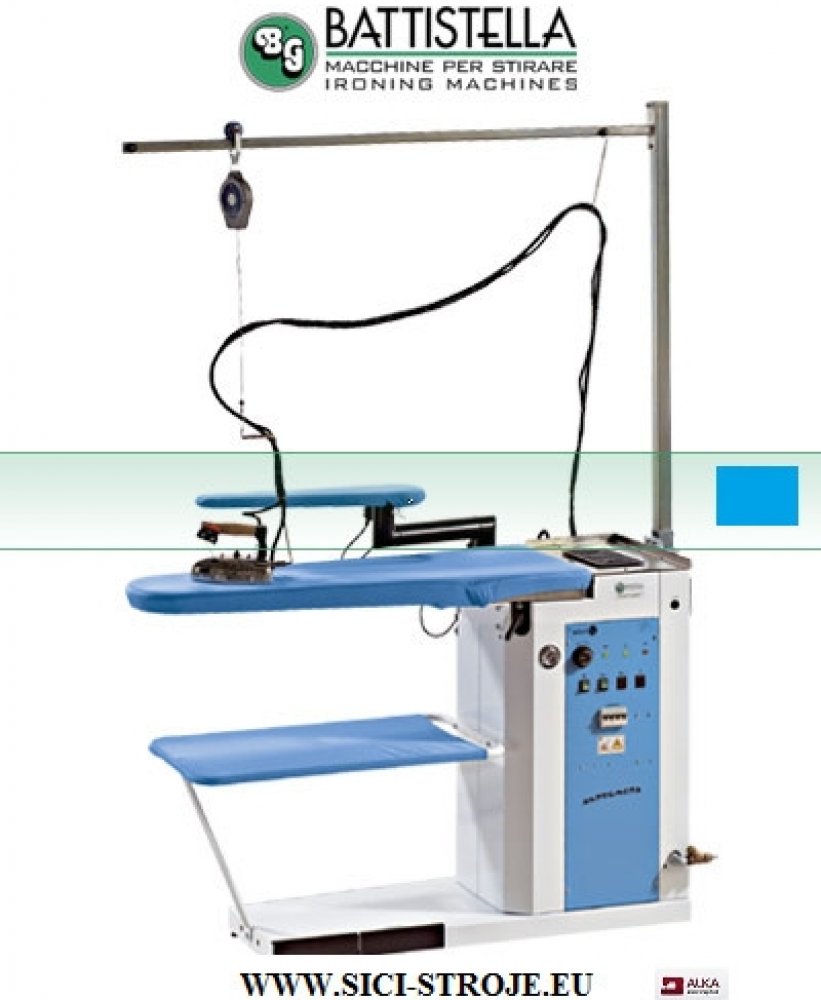 Žehlící prkno s typem desky 50x130 cm s automatickým vyvíječem páry. Příkon vyvíječe 6,6 kW, kotel o obsahu 10 lit., odsáváná a vyhřívaná žehlící deska, ofuk desky, napařování žehlící desky, výška 92 cm, vyhřívaný a odsávaný rukávník 0,15kW, dvojitý pedál umožňující obsluhu z obou stran stolu, zařízení na odstranění fleků (nerezové rameno), Napájecí napětí 400V,váha 112kg,rozměr stolu při práci 59...
