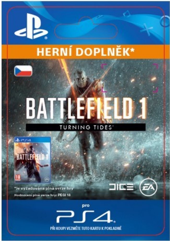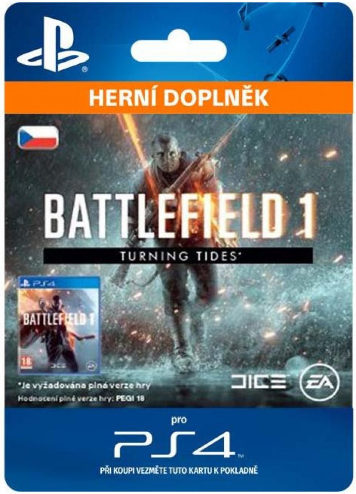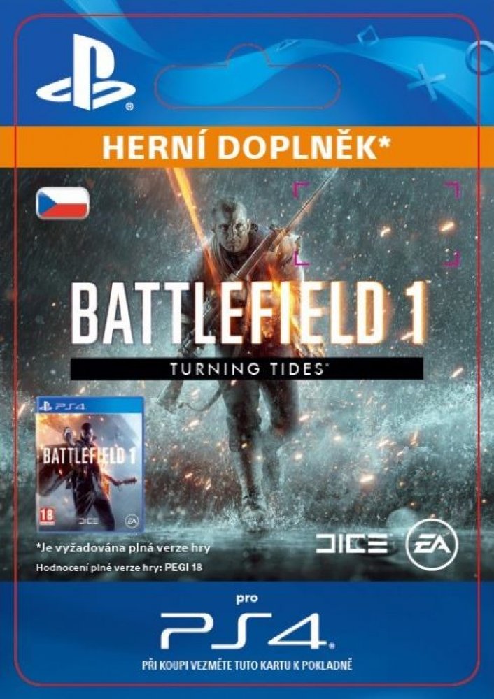 BATTLEFIELD™ 1 TURNING TIDES* Zapojte se do obojživelných operací první světové války. Pusťte se s novým torpédoborcem do taktických námořních bitev. Ovládněte novou třídu vzducholodě a zorientujte se v chaosu leteckých, pozemních a námořních bojů. Zažijte troufalý nájezd na Zeebrugge a podnikněte mohutný výsadek na pobřeží během bitvy o Gallipoli. Jednorázová licence na stahování do více systémů PS4. Pro využití na primárním PS4 není přihlášení k PSN vyžadováno, je však vyžadováno na ostatních systémech PS4. Než začnete tento produkt používat, přečtěte si důležité zdravotní informace v sekci Zdravotní varování. Tento kupon s kódem je vydán společností Sony Interactive Entertainment Network Europe Limited a jeho uplatnění mohou vůči vydavateli provést pouze uživatelé, kteří jsou držiteli účtu SEN (dříve známého jako účet v síti PlayStation®Network) registrovaného v České republice. Pro uplatnění kuponů s kódem pro obsah/služby klasifikované jako „18“ musejí být uživatelé držiteli hlavního účtu SEN starší 18 let. Kromě toho platí, že uživatelé musejí být starší 7 let a uživatelé do 18 let musí mít souhlas rodičů. Mohou platit ještě další věková omezení. Pro účty SEN platí Podmínky poskytování služeb PlayStation™Network (PSN). Přístup k obsahu/službám, na který se vztahuje tento kupon s kódem, podléhá Podmínkám poskytování služeb PlayStation™Network (PSN) a veškerým specifickým doplňujícím podmínkám, které se vztahují na obsah/služby, včetně Podmínek používání softwaru. Pokud si nepřejete přijmout tyto podmínky, nekupujte tento kupon s kódem. Je vyžadován systém PlayStation®3, PSP® (PlayStation®Portable), PlayStation®Vita, PlayStation®4 nebo jiný kompatibilní systém Sony a rovněž širokopásmové, Wi-Fi nebo 3G internetové připojení (v závislosti na vašem systému Sony). Za poplatky za připojení k internetu odpovídá uživatel. Funkce hry pro více hráčů v systému PlayStation®4 (v závislosti na odpovídajícím obsahu/službách) je dostupná pouze uživatelům s uhrazeným přihlášením k odběru služeb PlayStation®Plus. Tento kupon s kódem není možno proměnit za hotovost a nesmí být dále prodán nebo jinak vyměňován. V případě jeho ztráty, odcizení či jiného použití bez vašeho svolení nebude nahrazen Kód je platný pouze pro jednorázové použití. Jeho platnost vyprší 12 měsíců od data nákupu. Plné znění podmínek viz eu.playstation.com/legal „Síť SEN a obchod PlayStation®Store: je podporován pouze anglický jazyk.“ *VYŽADUJE HRU BATTLEFIELD 1 PRO PLAYSTATION®4 (V PRODEJI SAMOSTATNĚ), VŠECHNY HERNÍ AKTUALIZACE, PŘIPOJENÍ K INTERNETU A ÚČET EA. ZBRANĚ A VOJENSKÁ TECHNIKA NEJSOU VE HŘE VYOBRAZENY NA ZÁKLADĚ ŽÁDNÉ SMLOUVY, AŤ UŽ SPONZORSKÉ, PROPAGAČNÍ NEBO PARTNERSKÉ, S JAKÝMKOLI VÝROBCEM. “2”, “PlayStation”, “O” and “A” are registered trademarks of Sony Interactive Entertainment Inc. Also, “O” is a trademark of the same company. “Sony Entertainment Network” is a trademark of Sony Corporation. All rights reserved. © 2017 Electronic Arts Inc. EA, logo EA, logo DICE, Battlefield, Battlefield 1 a logo Battlefield 1 jsou ochranné známky společnosti Electronic Arts Inc.