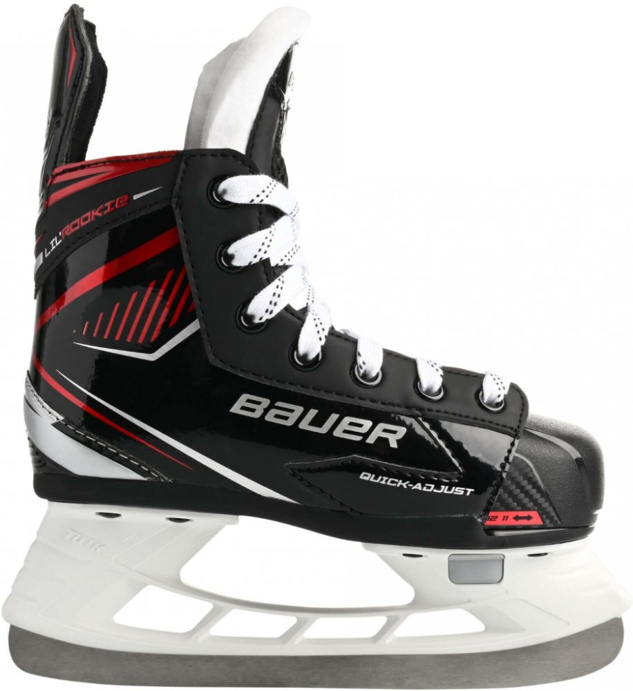 Určeno pro nejmenší děti, které se učí své první krůčky na ledě. Brusle jsou navrženy s důrazem na pohodlí, stabilitu a schopnost růst spolu s dětskou nohou. První brusle, které rostou s vaším dítětem! S BAUER Lil' Rookie bude učení bruslení snadné, bezpečné a zábavné. Konec každoročnímu kupování nových bruslí! Jednoduchý a spolehlivý mechanismus umožňuje stisknutím tlačítka posunout špičku brusle a upravit ji až o čtyři velikosti, což zajišťuje perfektní padnutí po několik sezón.|Místo klasických tkaniček jsou brusle vybaveny dvěma snadno ovladatelnými přezkami, které umožňují rychlé a bezpečné utažení boty i samotným dětem.|Vnitřní botička je vyrobena z komfortních a izolačních materiálů, které udržují dětské nohy v teple a pohodlí po celou dobu na ledě.|Vnější konstrukce brusle poskytuje vynikající oporu a stabilitu v oblasti kotníku, což je pro začínající bruslaře klíčové pro získání jistoty.|Brusle jsou osazeny kvalitním nožem z nerezové oceli, který je navržen pro rekreační bruslení a je připraven na první skluz po ledě.