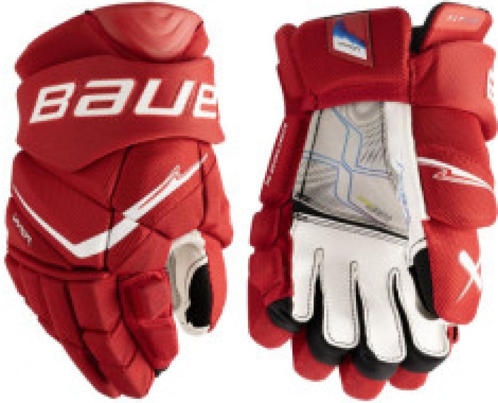 Hokejové rukavice - Junior • Profesionální - Amatér • Stupeň ochrany: vysoká • Střih: zkosený • Barva: červená - bílá - modrá • Provedení prstů: 2-dílně členěné prsty - 3-dílně členěný ukazováček - 3-dílně členěný prostředníček • Provedení palce: 3-dílný • Materiál dlaně: DuraConnekt - Dyneema™ thread