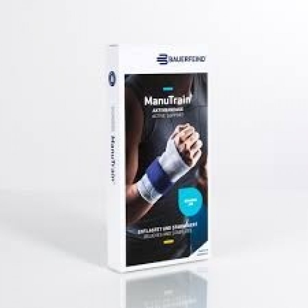 ManuTrain je anatomicky tkaná dvoutažná bandáž na stabilizaci zápěstí. Anatomicky tvarovaná výztuha je tepelně tvarovatelná a tím individuálně přizpůsobitelná, zabezpečuje ideální držení zápěstí a omezuje jeho pohyb. Přiložená páska se suchým zipem slouží k fixaci dlahy a současně stabilizuje zápěstí. Vlastnosti ManuTrain je aktivní bandáž ke stabilizaci zápěstního kloubu. Komfortní zóna mezi palcem a ukazováčkem pro uchopení předmětů, chránící před podrážděním kůže. Nový koncept pleteniny: obzvláště elastický, prodyšný a odvádějící vlhkost pro účinnou kompresi vynikající komfort při nošení. Jedná se o anatomicky tvarovanou, dvoutahovou bandáž. Funkční nastavení ruky podle dané indikace díky adaptabilní dlaze uvnitř bandáže. Dodatečná upínací páska umožňuje fixaci vnitřní dlahy ruky. Různé provedení pro pravou a levou stranu Natahovací pomůcka přiložená Video: