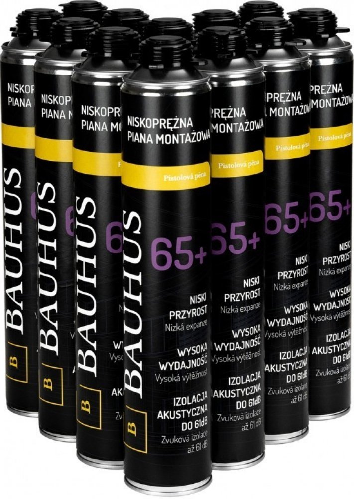 Montážní pěna 65+ Bauhus je pistolová pěna s krátkou dobou vytvrzení, která se vyznačuje vysokou účinností a vysokou tepelnou izolací.