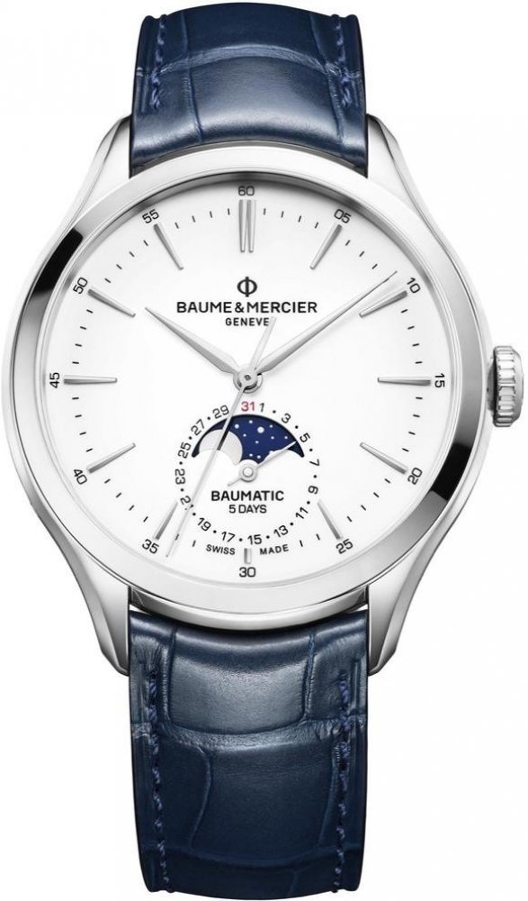 Elegantní pánské hodinky Baume & Mercier Clifton s manufakturním automatickým strojkem Baumatic BM14-1975A, který je možno pozorovat přes průhledné víčko. Strojek má rezervu chodu až 120 hodin a disponuje velkou přesností, kterou potvrzuje certifikát COSC (švýcarský institut pro testování chronometrů). Esteticky vyvedený bílý číselník nabízí rovněž datum a měsíční fázi. Doplňuje jej kožený řemínek...