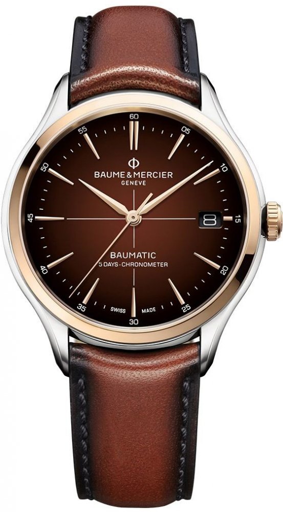 Luxusní pánské hodinky Baume & Mercier Clifton vás už na první pohled zaujmou nádherným dvoubarevným pouzdrem z leštěné nerezové oceli a 18 karátového růžového zlata. Pouzdro o průměru 40 mm ukrývá švýcarský automatický strojek Baumatic BM13-1975A s rezervou chodu 120 hodin. Jeho práci můžete sledovat skrze prosklené dýnko. Při každém pohybu pak můžete vidět, jak se otáčí gravírovaný oscilační rotor. Pod vysoce odolným safírovým sklem s antireflexní vrstvou se nachází gradientní hnědý číselník, na kterém jsou umístěny indexy a elegantní hodinové ručičky z růžového zlata. Číselník je dále doplněn okénkem data na 3 hodině. Hodinky z dílny Baume & Mercier doplňuje nápadný hnědý kožený řemínek s překlápěcí sponou z nerezové oceli. Doslova bezchybné zpracování těchto hodinek si získá i ty nejnáročnější muže.