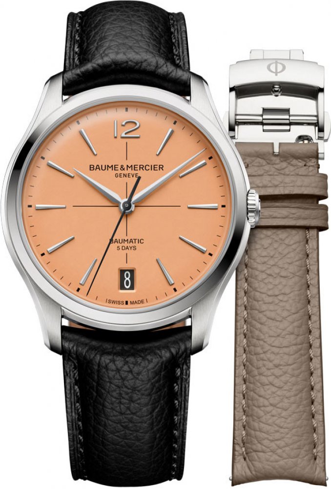 Hodinky Baume & Mercier Clifton Baumatic M0A10778 představují dokonalé spojení klasického designu a moderní hodinářské technologie. Tato limitovaná edice čítající pouze 350 kusů zaujme elegantním lososovým ciferníkem s černou minutovou stupnicí a kontrastní sekundovou ručkou.Pouzdro z broušené nerezové oceli o průměru 39 mm a výšce 11,22 mm skrývá automatický strojek Baumatic BM13-1975A s rezervou chodu až 120 hodin. Safírové sklíčko s antireflexní úpravou chrání ciferník, zatímco průhledné dýnko umožňuje nahlédnout na precizní mechaniku strojku.Hodinky jsou vybaveny elegantním černým řemínkem z teletiny a druhým ve stylové barvě moka. Oba pásky lze díky praktickému systému EasyClip snadno vyměnit bez použití nástrojů. Voděodolnost do 50 metrů poskytuje spolehlivou ochranu při každodenním nošení.