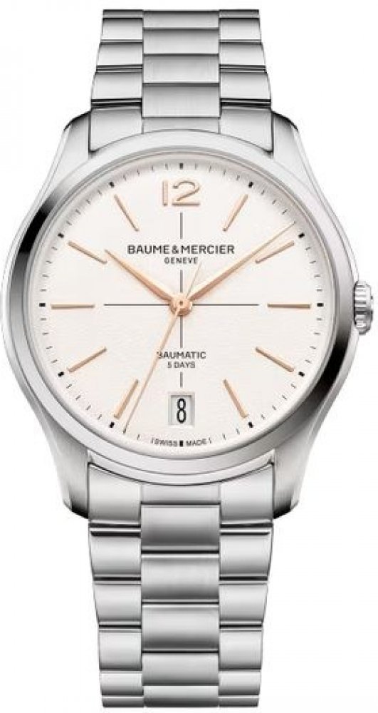 Baume & Mercier analogové ocel ocel 50 m automatické safírové elegantní pánské automatické bez osazení Clifton kulaté stříbrná béžová motýlková spona 2 cm pro běžné použití (30–50 m) bez svícení s občasnou údržbou (automatické) bez chytrých funkcí na ruku švýcarské s arabskými číslicemi 3.9 cm střední pevná 120 h 11.22 mm 11.22 mm 39.0 mm