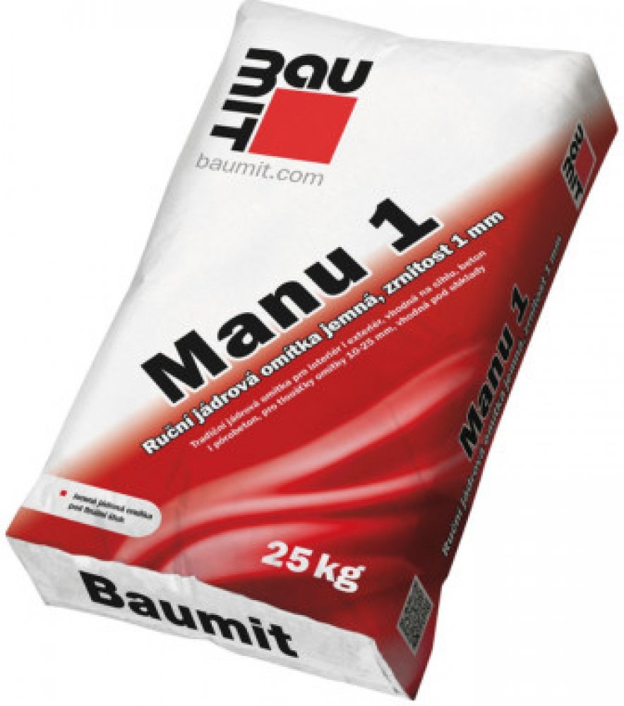 Jemná ruční vápenocementová omítka pro interiér i exteriér, ideální pod finální štuk. Baumit Manu 1 je jemná ruční vápenocementová jádrová omítka vhodná pro použití v interiéru i exteriéru. Je určena pro lokální vysprávky i celoplošné nanášení na minerální podklady, jako jsou cihly, pórobeton, beton nebo vápenopískové zdivo. Omítka je paropropustná, což přispívá k zdravému vnitřnímu klimatu. Díky jemné zrnitosti do 1 mm vytváří hladký povrch, ideální jako podklad pod finální štukové vrstvy nebo obklady.
