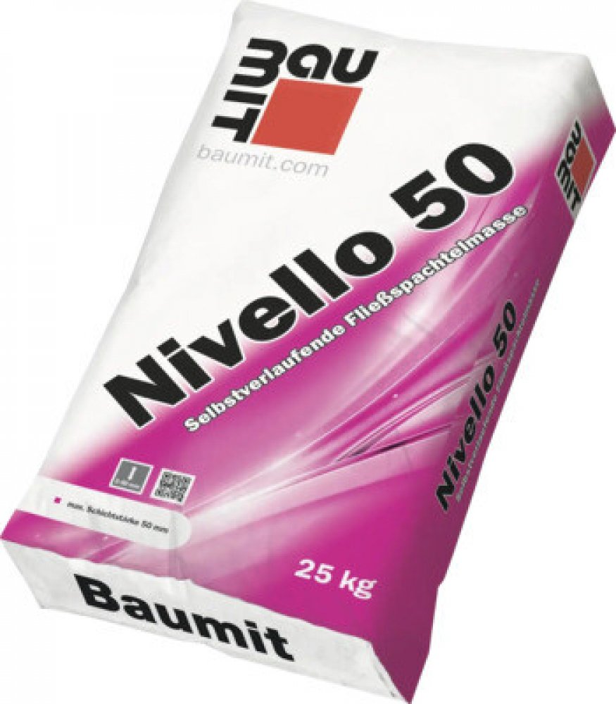 Baumit Nivello 50 vsypat do míchací nádoby s předepsaným množstvím chladné, čisté vody a zamíchat pomaluběžným míchadlem (max. 600 ot/min.) do homogenní hmoty bez hrudek a žmolků. Doba míchání cca 2-3 minuty. Po 5 minutách odležení znovu krátce promíchat. Doba zpracovatelnosti čerstvě zamíchané hmoty je max. 30-35 minut, při +20 °C a max. 70 % relativní vlhkosti vzduchu.