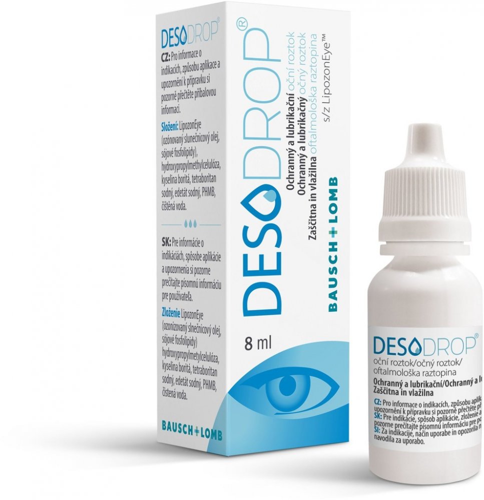 Ochranné, lubrikační a zklidňující oční kapky. Desodrop oční roztok je zdravotnický prostředek, který intenzivně zvlhčuje a chrání povrch oka, umožňuje očím zklidnění a podporuje hojivé procesy. Používá se k léčbě příznaků souvisejících se zánětem oka, včetně zánětů infekčního původu. Desodrop je vhodný k ošetření suchého oka při nestabilitě slzného filmu, i při podráždění, které bylo způsobeno podmínkami okolního prostředí nebo mechanickým namáháním, jako je například nošení kontaktních čoček. Neobsahuje konzervační látky, dobře se vstřebává a je výborně snášen pacienty bez omezení věku. Kdy použít Desodrop oční roztok? k léčbě příznaků souvisejících se zánětem oka, včetně zánětů infekčního původu k lubrikaci a ochraně rohovky před a po operačním zákroku k podpoře regeneračních procesů po chirurgickém zákroku nebo po úrazu v případě odřenin, poranění rohovky, používání kontaktních čoček při antibiotické léčbě u dospělých i dětí k ošetření suchého oka Jak Desodrop oční roztok působí? Desodrop díky obsahu ozonizovaného oleje a lipozomů snižuje schopnost bakterií vytvářet biofilm a podporuje jeho rozklad. Biofilm představuje přirozený obranný mechanismus pro bakterie, který mohou tvořit na povrchu oka, zejména při odřeninách a poranění oka, nebo na kontaktních čočkách. Odstraněním biofilmu se vytvoří nepříznivé prostředí pro množení bakterií, které jsou náchylnějšími k přirozené obranyschopnosti oka a vůči antibiotikům, a tím se snižují zánětlivé příznaky způsobené bakteriemi.Obsažený rostlinný olej a lipozomy podporují stabilizaci lipidové vrstvy slzného filmu, snižují odpařování vodné vrstvy a zajišťují okamžitou úlevu pro oči.Použitý rostlinný olej je ozónizován, a proto neobsahuje konzervační látky; díky obsahu lipozomů se dobře vstřebává a je výborně snášen. Dávkování: 1-2 kapky jednou nebo vícekrát denně dle potřeby. Před použitím přípravku si důkladně umyjte ruce. Lahvičku protřepejte a při aplikaci dbejte, aby špička lahvičky nepřicházela do kontaktu s okem. Po každém použití lahvičku pevně uzavřete. V případě, že používáte více očních přípravků, udržujte mezi jejich aplikací časový odstup 15 minut. V profylaxi před operací se aplikace doporučuje tři dny před plánovaným zákrokem. Složení: LipozonEye (ozónovaný slunečnicový olej, sójové fosfolipidy), hydroxypropylmethylcelulóza, kyselina boritá, tetraboritan sodný, edetát sodný, PHMB, čištěná voda. Rostlinný olej je ozónován, proto neobsahuje konzervační látky. Upozornění: Přípravek nepoužívejte, pokud jste alergický(á) na kteroukoli jeho složku. Přípravek nepoužívejte déle než 28 dnů od prvního otevření. Mírná změna opalescence očního roztoku nepředstavuje změnu kvality produktu. Uchovávejte mimo dosah dětí. ZDRAVOTNICKÝ PROSTŘEDEK, ČTĚTE PEČLIVĚ NÁVOD K POUŽITÍ A INFORMACE O BEZPEČNÉM POUŽÍVÁNÍ.