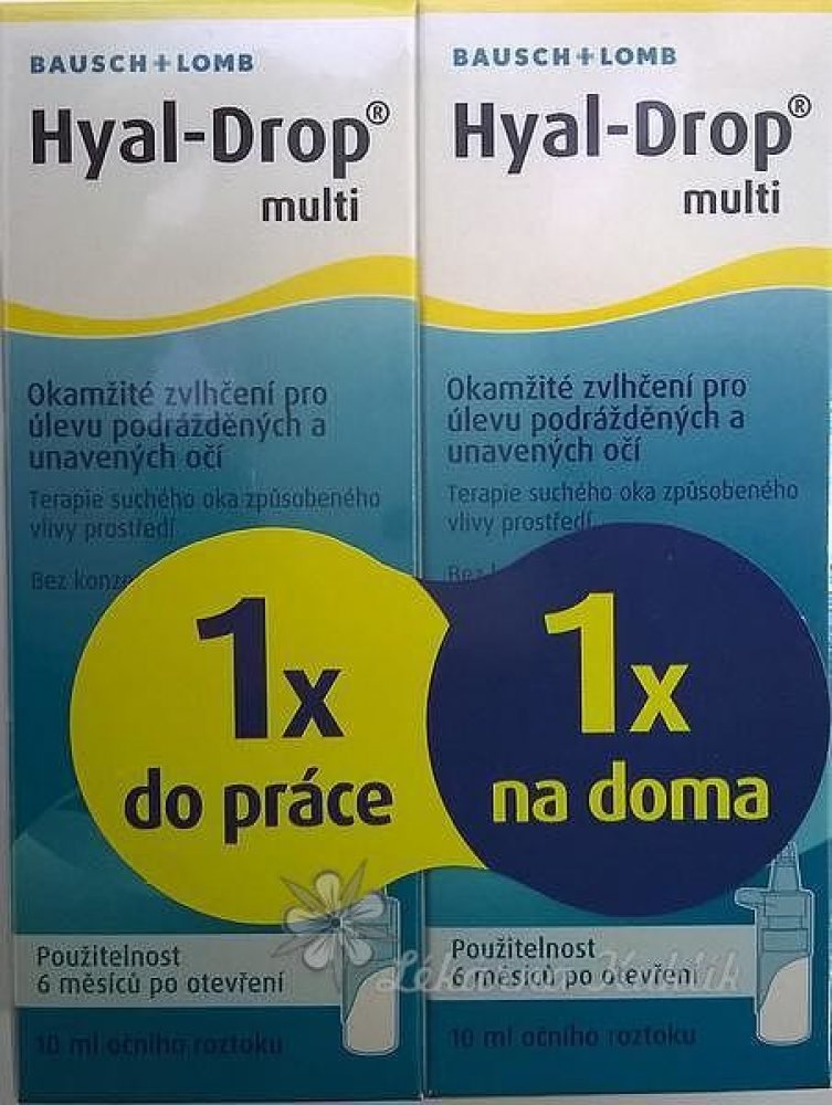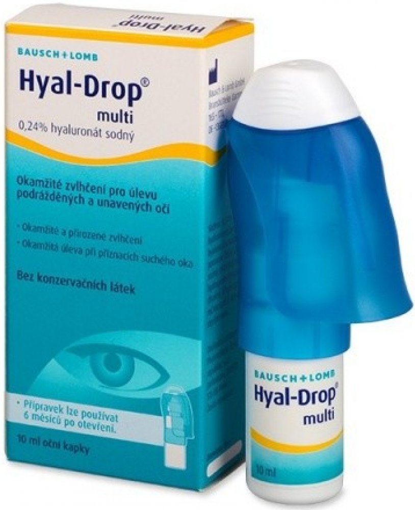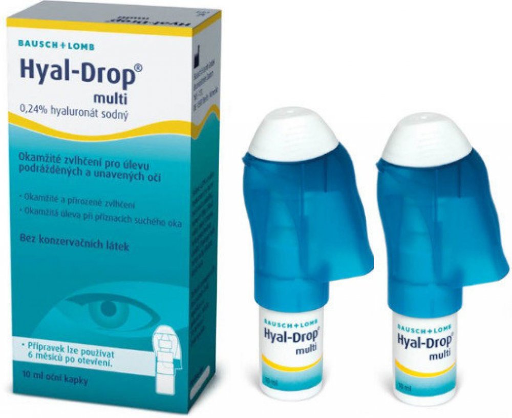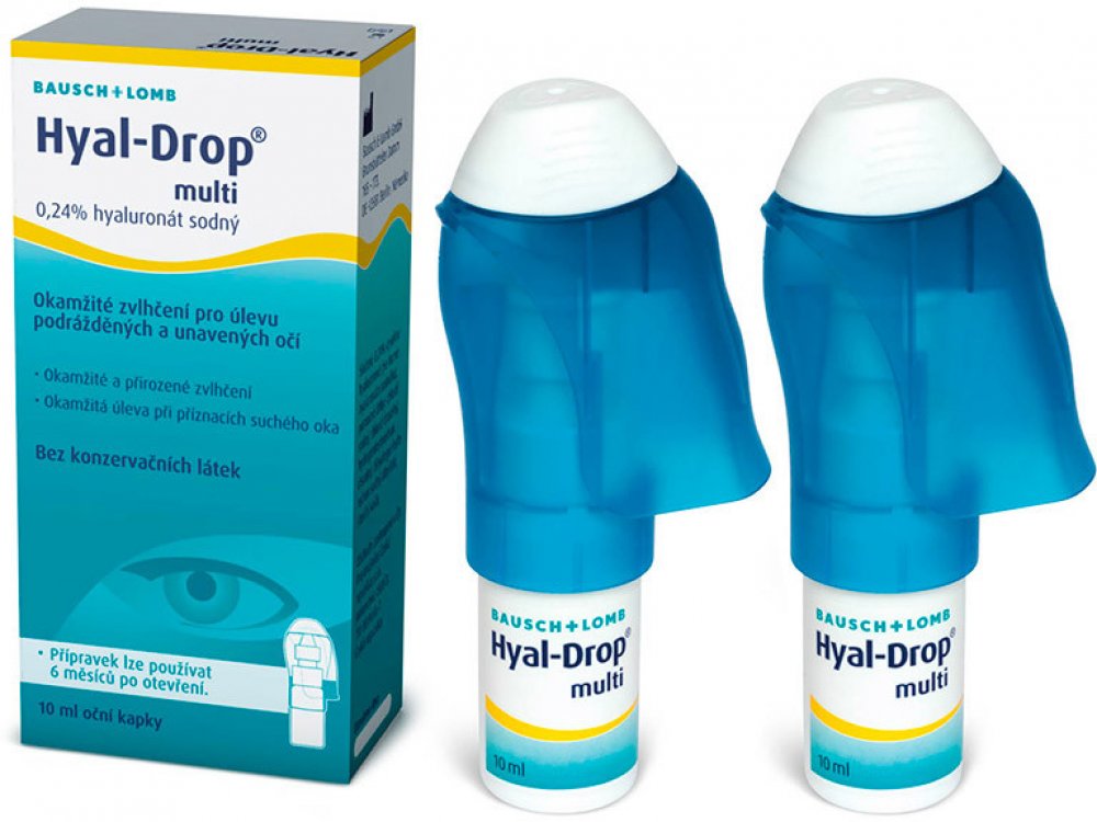 Složení: kyselina hyaluronová 2,4 ml/mg-Kyselina hyaluronová je součástí každé tkáně lidského těla. Její hlavní úlohou je udržet a/nebo zvýšit lubrikaci pomocí navázání molekul vody. Možná znáte pocit suchosti „své vlastní kůže”; právě v této situaci je místo pro kyselinu hyaluronovou. Věděli jste například, že všechny pohyby jsou uskutečňovány s pomocí kyseliny hyaluronové, protože zvlhčuje Vaše klouby? Kyselina hyaluronová je dnes pravděpodobně jedna z neintenzivněji zkoumaných látek v medicíně. Její použití bylo zkoumáno v mnoha klinických studiích. Použití: zvlhčuje povrch očí, příjemně oči osvěžuje, uklidňuje a přináší dlouhotrvající pocit úlevy od potíží souvisejících s nedostatečným zvlhčováním očí. Díky inovativnímu řešení s využitím patentovaného pumpičkového mechanismu vyhovuje Hyal-Drop® multi zvyšujícím se požadavkům kladeným na moderní zvlhčující roztok. Účinky Zlepšuje zvlhčení očního povrchu a slouží jak k vlhčení kontaktních čoček, tak k jejich opakovanému zvlhčování během nošení. Dávkování Jelikož Hyal-Drop multi neobsahuje konzervanty, můžeme ho používat každý den a jak často chceme. Kapeme 1 kapku do spojivkového vaku. Díky patentovanému pumpičkovému mechanizmu lze přípravek Hyal-Drop multi používat 12 týdnů od otevření. Složení 2,4 mg/ml kyseliny hyaluronové