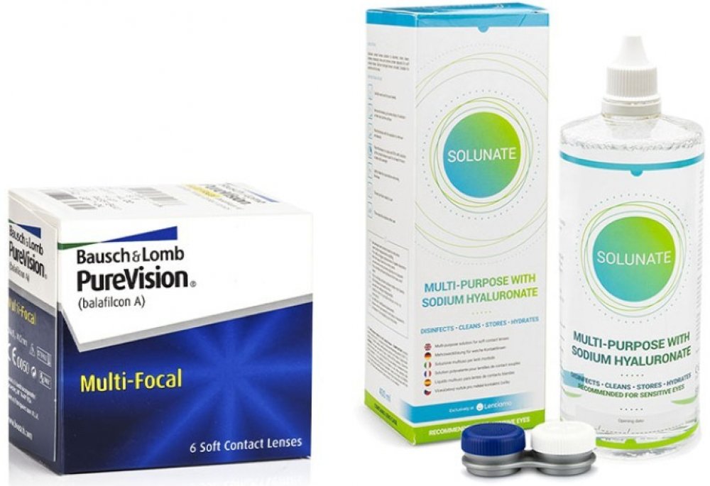 Měsíční kontaktní čočky PureVision Multi-Focal nabízíme ve zvýhodněném balíčku s roztokem Solunate Multi-Purpose 400 ml. PureVision Multi-Focal (6 čoček) jsou silikon-hydrogelové kontaktní čočky, určené ke korekci presbyopie. Jsou předepsány k nepřetržitému dennímu nošení s měsíční výměnou. Díky modernímu silikon-hydrogelovému materiálu představují velmi zdravý způsob nošení kontaktních čoček s dostatečným vyživováním rohovky. Solunate je nový víceúčelový roztok italské výroby, který uživatelům kromě vysoké kvality nabízí i ekonomicky výhodné balení za příznivou cenu. Větší balení 400 ml vám poskytne možnost používat roztok o 5 dní déle než roztoky v běžné velikosti (360 ml) a to za srovnatelnou cenu. Optimální poměr kvality a ceny řadí roztok Solunate mezi velmi oblíbené roztoky na trhu. Solunate je jedním z nejprodávanějších roztoků v našem e-shopu a je skvělou alternativou pro jiné univerzální roztoky jako jsou například ReNu MPS Sensitive Eyes, Biotrue Multi-Purpose nebo řada OPTI-FREE. Univerzální roztok Solunate s obsahem kyseliny hyaluronové je určený k čištění, dezinfekci, zvlhčování, oplachování a uchovávání všech měkkých kontaktních čoček včetně silikon-hydrogelových. Roztok odstraňuje bílkovinové usazeniny a je vhodný pro citlivé a suché oči. Složení roztoku Solunate je optimálně vyvážené – zaručuje dostatečnou účinnost a zároveň minimalizuje podráždění oka. Díky složení s obsahem kyseliny hyaluronové má roztok Solunate schopnost dlouhodobé hydratace a zabraňuje tak nepříjemnému pocitu suchého oka. Kyselina hyaluronová má vynikající schopnost vázat vodu a v roztoku funguje jako vysoce efektivní lubrikant. Na oku vytváří ochranný film, který snižuje tření mezi očním víčkem a rohovkou, což je blahodárné pro podrážděné a suché oči. Kontaktní čočky tak vydrží dostatečně hydratované po celý den a jejich nošení je ještě pohodlnější a komfortnější. Součástí balení roztoku Solunate je také pouzdro na kontaktní čočky, které je inovativně umístěno přímo na lahvi roztoku a stává se tak její součástí. Díky tomu máte pouzdro při použití roztoku vždy k dispozici a nikdy se vám při cestách neztratí.