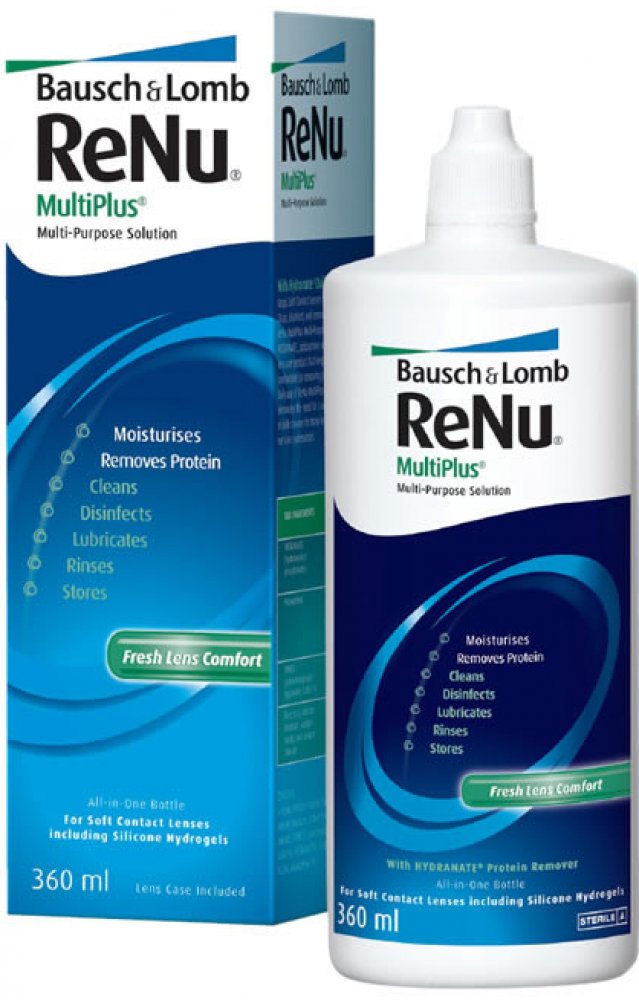 Roztok ReNu MultiPlus je víceúčelový šetrný roztok, který jemně čistí, oplachuje a dezinfikuje Vaše kontaktní čočky. Efektivně odstraňuje bílkovinové usazeniny a lipidy pomocí ingredience HYDRANATE. Je určen pro všechny druhy hydrogelových i silikonhydrogelových kontaktních čoček, které uchovává neustále měkké. Obsahuje kyselinu boritou, která vyrovnává narušení pH na kontaktních čočkách. Roztok ulehčuje péči o čočky, efektivně je ošetřuje a dělá je čistšími a komfortnějšími.