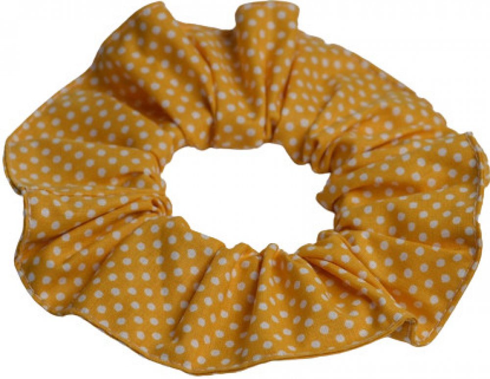 Bavlněná scrunchie gumička do vlasů tmavě žlutá s bílým puntíkem