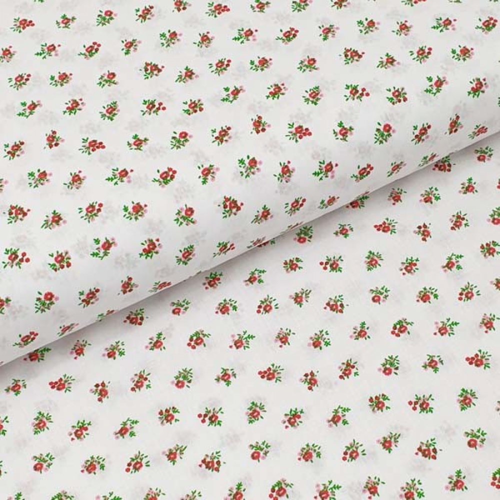 Bavlněné plátno bílé, růžové drobné kytice. Složení látky 100% bavlna. Metráž má šířku 140 cm. Bavlněné látky se používají ke zhotovení šatů, sukní, kalhot. Bavlněné plátna se také využívají k dekoračním účelům, na šití bytových doplňků, na patchwork, quilting, polštářky, šátky, zástěry.