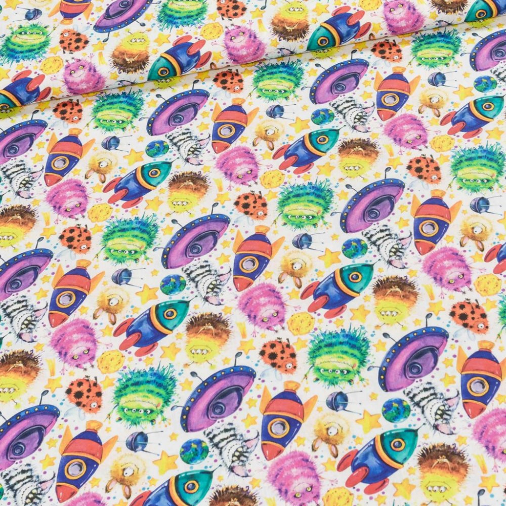 Bavlněná látka (tkanina) se vzorem příšerek s ufo na bílém podkladu. Látka je v šířce 140 cm, vyrobena ze 100% bavlny (gramáž 135g/m2) v plátnové vazbě. Vzor látky je natištěn jen z jedné strany z druhé strany je látka bez potisku.