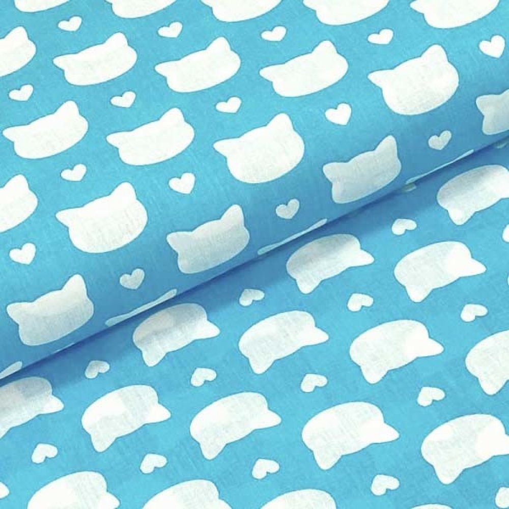 Bavlněné plátno aqua, bílé kočičí hlavy a srdíčka. Látka má složení 100% bavlna. Šířka plátna 140 cm. Bavlněné látky se používají ke zhotovení šatů, sukní, kalhot. Bavlněná plátna se také využívají k dekoračním účelům, na šití bytových doplňků, na patchwork, quilting, polštářky, šátky, zástěry.