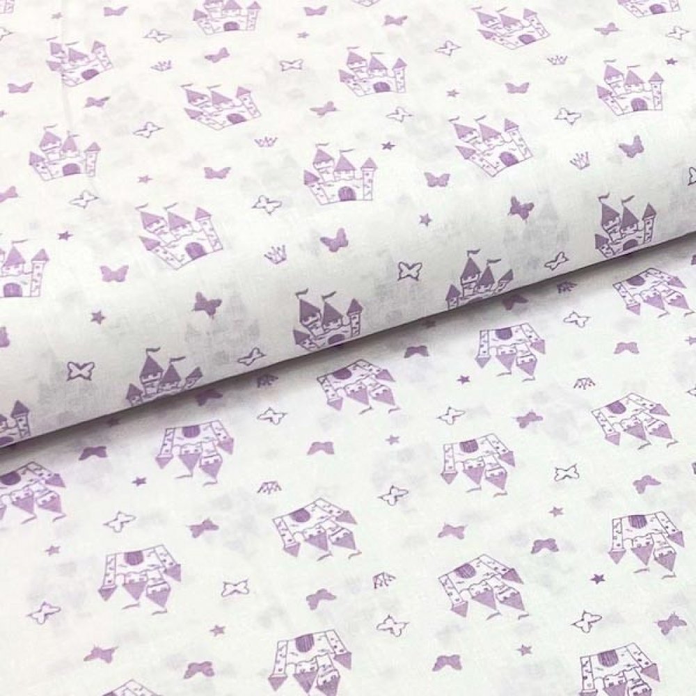 Bílé bavlněné plátno, lila hrad. Látka má složení 100% bavlna. Šířka plátna 140 cm. Bavlněné látky se používají ke zhotovení šatů, sukní, kalhot. Bavlněná plátna se také využívají k dekoračním účelům, na šití bytových doplňků, na patchwork, quilting, polštářky, šátky, zástěry.