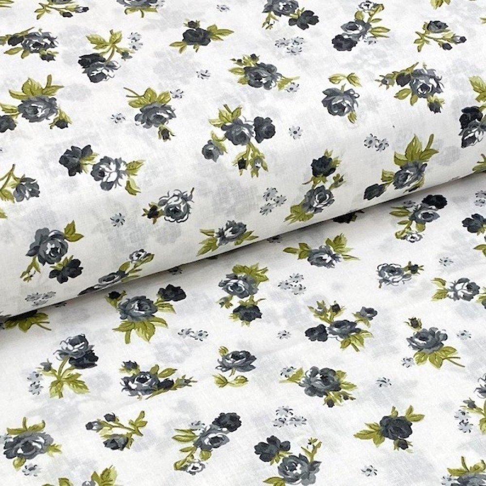 Bílé bavlněné plátno, šedý květinový vzor. Složení látky 100% bavlna. Metráž má šířku 140 cm. Bavlněné látky se používají ke zhotovení šatů, sukní, kalhot. Bavlněné plátna se také využívají k dekoračním účelům, na šití bytových doplňků, na patchwork, quilting, polštářky, šátky, zástěry.