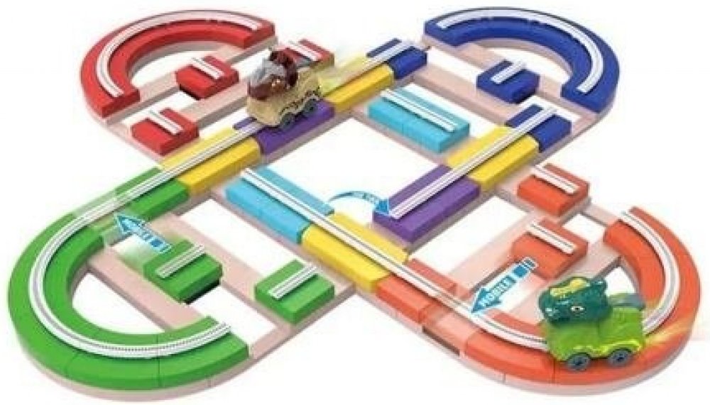 Barevná autodráha s dinosaury, kterou si nejprve musíte postavit. Autodráha se skládá ze 143 prvků pro stavbu dráhy a 2 aut s hlavami dinosaurů. Hračku lze umístit na rovný povrch v libovolném sestavení tak, aby byla zachována kontinuita jízdy, ale lze ji pomocí přísavek připevnit i na svislou hladkou rovnou stěnu. Auto se pohybuje po kolejích, během jízdy můžete pohybem bloků měnit jeho směr. Kdy...