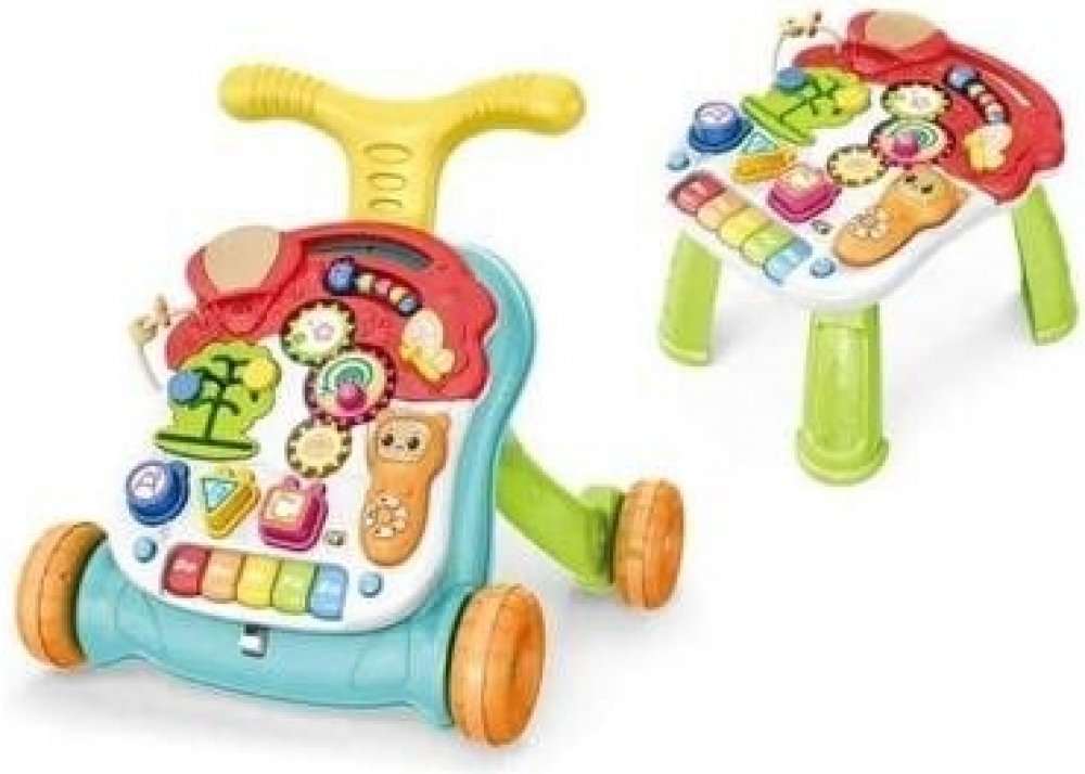 Dětské chodítko na baterie s mnoha zajímavými funkčními prvky přispívá k rozvoji jemné motoriky, zraku, sluchu, pohybu, inteligence a dalších dovedností vašeho dítěte. Různé zvukové a světelné efekty přitahují pozornost vašeho dítěte a podporují tak jeho zrakové a sluchové schopnosti. Přední část chodítka lze odejmout a připevnit k postýlce nebo přeměnit na hrací stolek. Ke zvýšení stability chodítka lze použít vodu nebo písek. Výhody dětského chodítka: - Zadní kolečka s protiskluzovým povrchem a regulací rychlosti - chrastítka - ozubená kolečka s veselými zvuky při hře - 5 tlačítek s hudebním do re mi fa so - mnoho melodií - odnímatelné rozpoznatelné tvary - kruh, trojúhelník, čtverec - pohyblivý ovocný strom - světelný horkovzdušný balón bliká, při přehrávání melodie nebo zvuku - zpívající motýl - odnímatelný multifunkční malý mobilní telefon Chodítko má robustní konstrukci, jeho části jsou bezpečné díky zaobleným hranám a jsou vyrobeny ze zdravotně nezávadného a kvalitního plastu. Rozměry balení: 39 x 35 x 15,5 cm Rozměry chodítka: 36 x 45-46 x 40 cm Rozměry stolku: 24 x 21 x 34 cm Materiál: plast Věk: 6m+