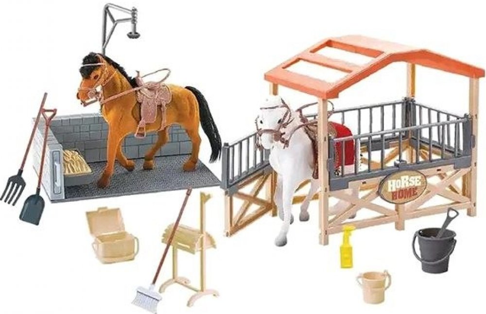 Farmářská hrací sada s velkou ohradou, mycím koutem a stáním pro koně. Péče o koně a jeho srst je nezbytná každý den. Po vyjížďce na koni je potřeba koně pořádně umýt a vyhřebelcovat. Obsah balení: mycí kout stání pro koně 2 koně 1 hříbě ploty, vidle, lopata a další příslušenství Parametry: Rozměry balení: 33 x 27 x 18 cm Rozměry: mycí kout 22x21,5x15cm, stáj 13x21x20 cm Hmotnost balení: 1 kg Materiál: plast Věk: 3+ Produkt rozvíjí: tvořivost a kreativitu sociální dovednosti hraní rolí koordinaco oko-ruka logické myšlení a samostatnost hmatové a smyslové dovednosti představivost a soustředění Hezké rozšíření pro hru s koníky.