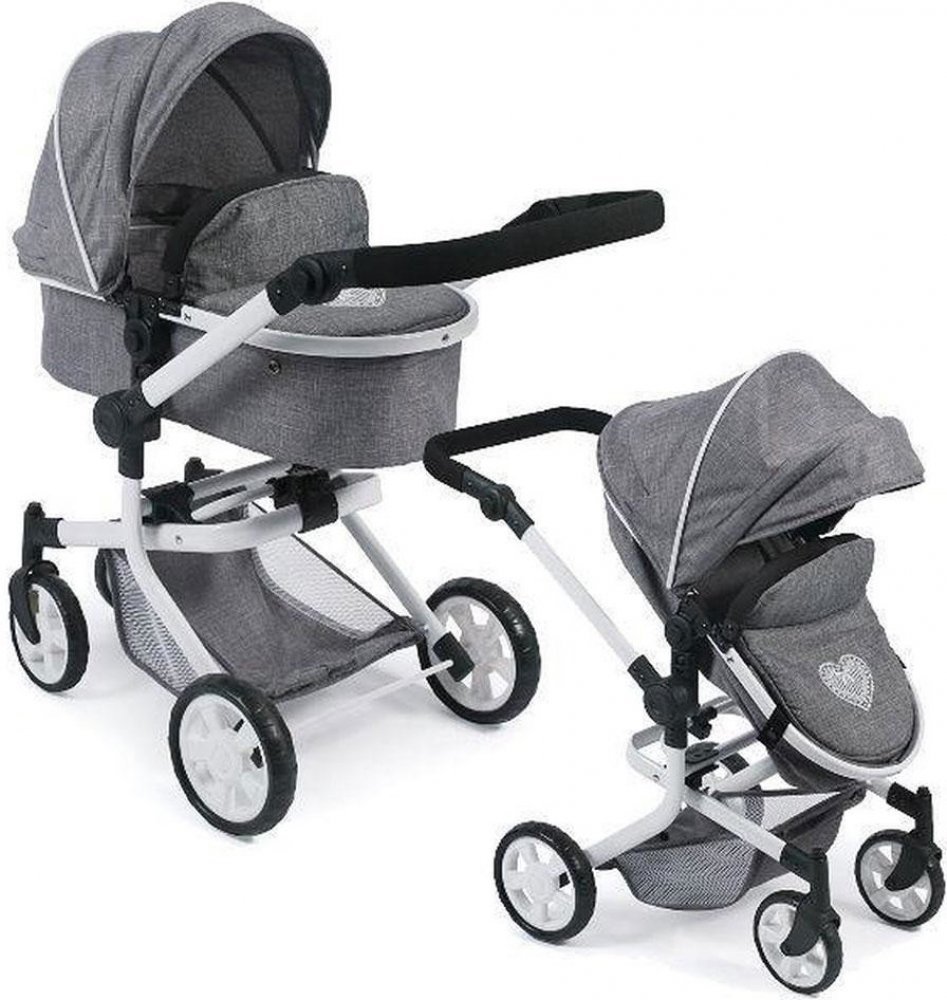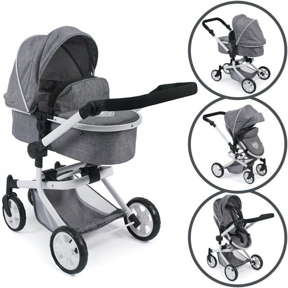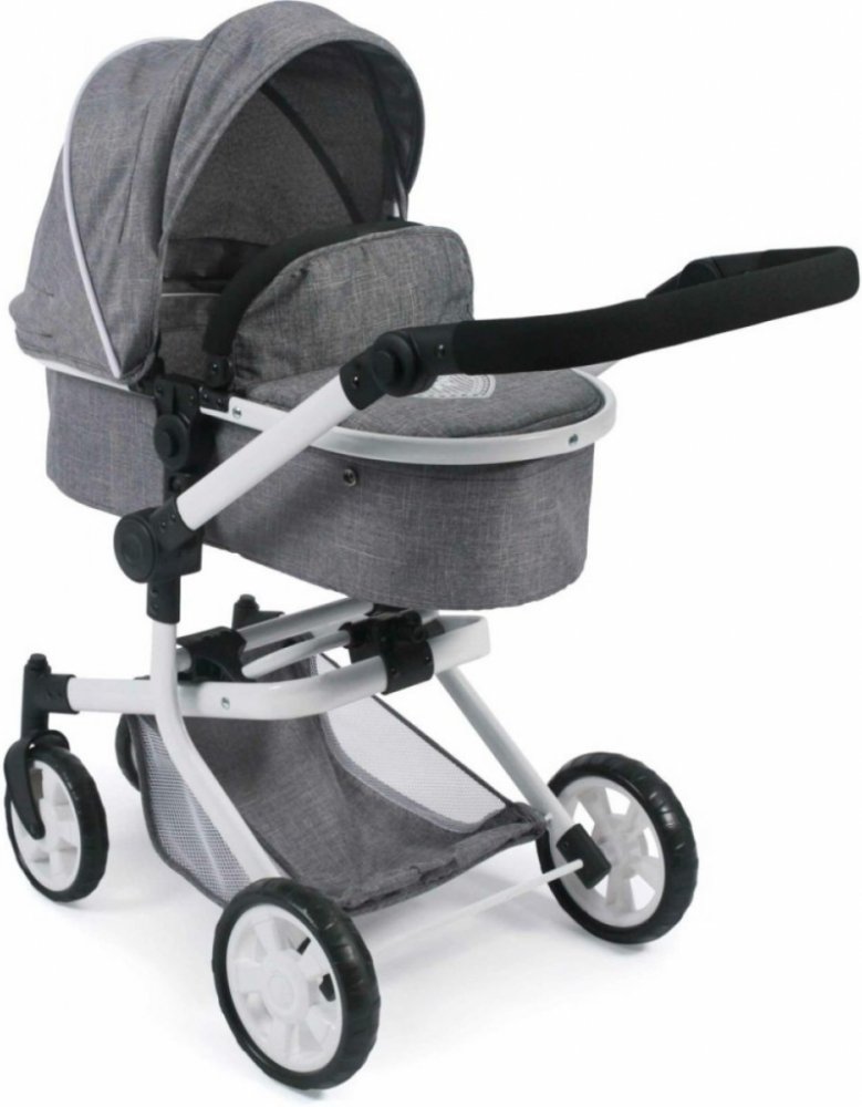 Kočárek – dvojkombinace. Z jedné korbičky můžete udělat hlubokou i sportovní variantu. Na pevném podvozku, který má 2 otočná kolečka a 2 pevná, je nasazená korbička, která se dá nasadit po i proti směru jízdy. Na podvozku je připevněná veliká síťka.