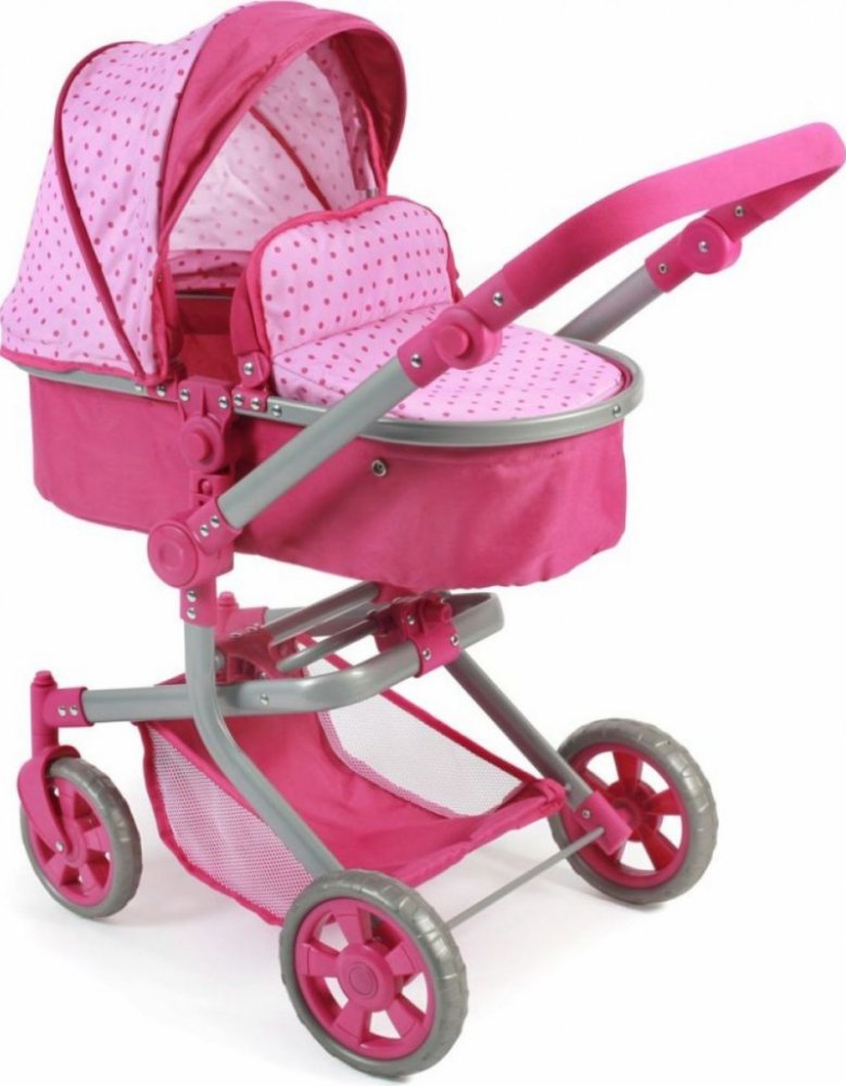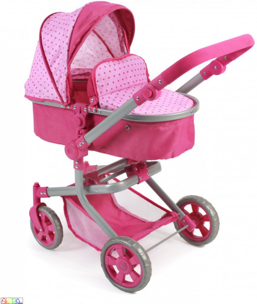Kočárek – dvojkombinace. Z jedné korbičky můžete udělat hlubokou i sportovní variantu. Na pevném podvozku, který má 2 otočná kolečka a 2 pevná, je nasazená korbička, která se dá nasadit po i proti směru jízdy. Na podvozku je připevněná veliká síťka.