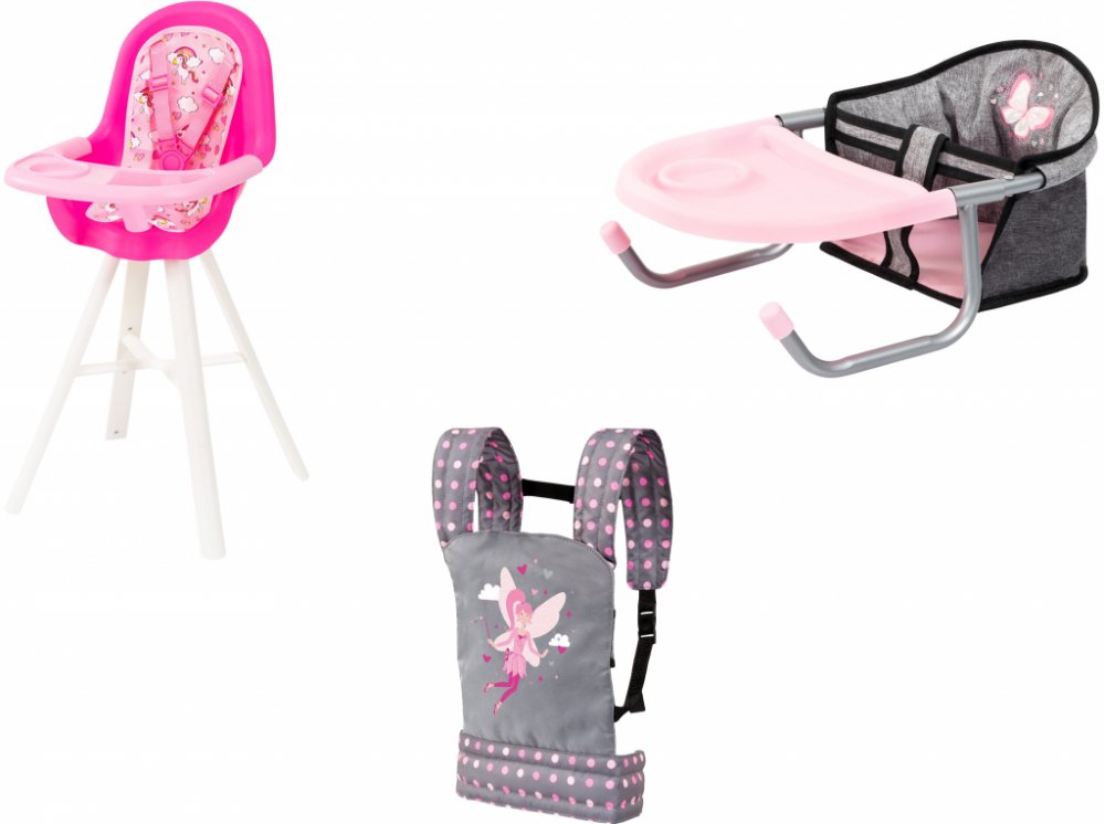 Bayer Design® Doplňky pro panenky Nosítko pro panenky Vhodné pro plyšové hračky nebo panenky do velikosti cca 46 cm Panenku lze nosit vpředu i na zádech Měkké a široké ramenní popruhy a široký bederní pás Integrované sedátko na vnitřní straně nosítka Vysoká židle pro panenky Panenku lze pohodlně krmit díky integrovanému podnosu Vhodná pro panenky s velikostí do cca 46 cm Díky nastavitelným bezpečn...